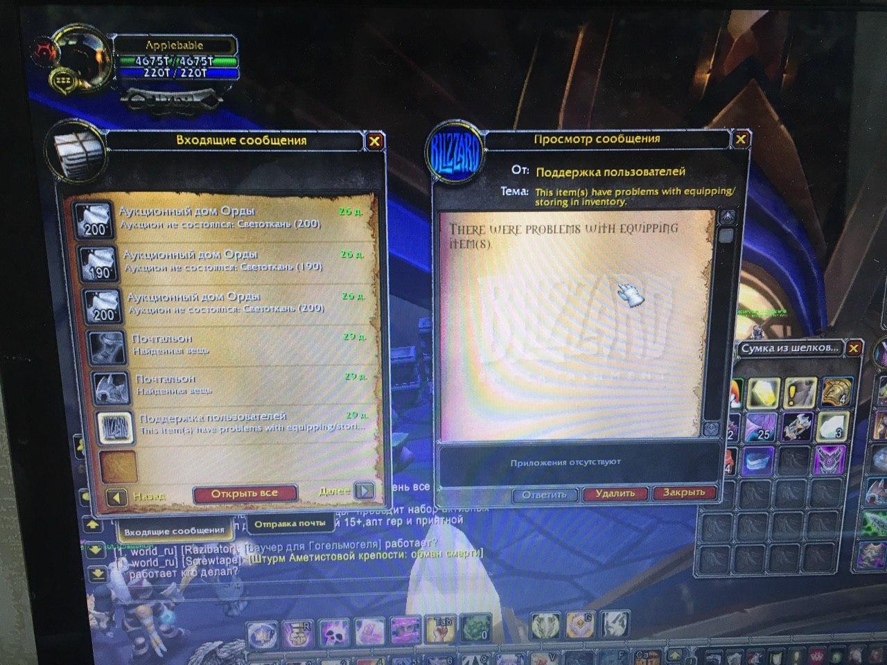| Description | Во время прохождения локального задания на аргусе, мне кинул пати друид с фана, после принятия приглашения меня выкинуло с игры в окно выбора персонажей. После захода в игру у моего паладина была изменена специализация (с воздаяния на свет) и при этом артефакт "Испепелитель" был помещён в сумку. После того как я его одел я понял что его уровень сброшен к 0 (именно уровень артефакта, уровень предмета и реликвии в нём остались невредимы). Я немедленно отправился в оплот, потому что начал нервничать. Начав качать его обратно мне удалось дойти лишь до 70 уровня артефакта, хотя у меня был 78-80 (ориентировочно потому что несколько дней с 77 качал и не бегал в оплот). Никнейм паладина - Applebable Реалм - х100 Время случившегося 27.04.2020 19:00 - 19:10 по Украине. | ||||