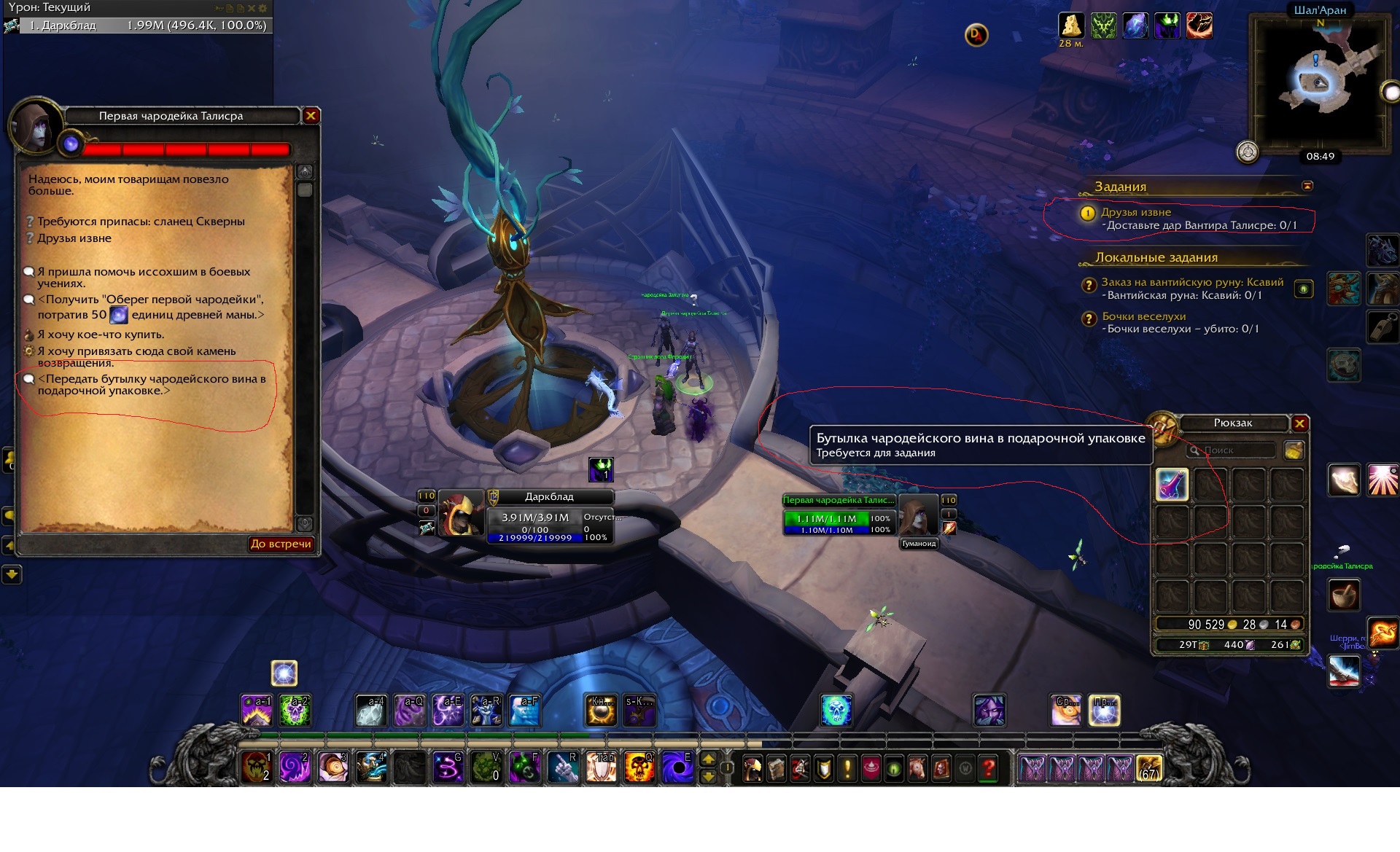 | Description | Не работает квест https://ru.wowhead.com/quest=42487 . суть квеста принести Талисре вино. В разговоре с Талисрой есть фраза "Передать вино". Нажимаю она говорит фразу (по сценарию) вино не исчезает кв не защитывается. Дальше невозможно продолжить цепочку по сурамару. Пробывал отменять. все повторяется тем же образом. Берёшь кв . зажигаешь портал. Портируешься к Талисре и не можешь отдать вино. Скриншоты прилагаю. | ||||