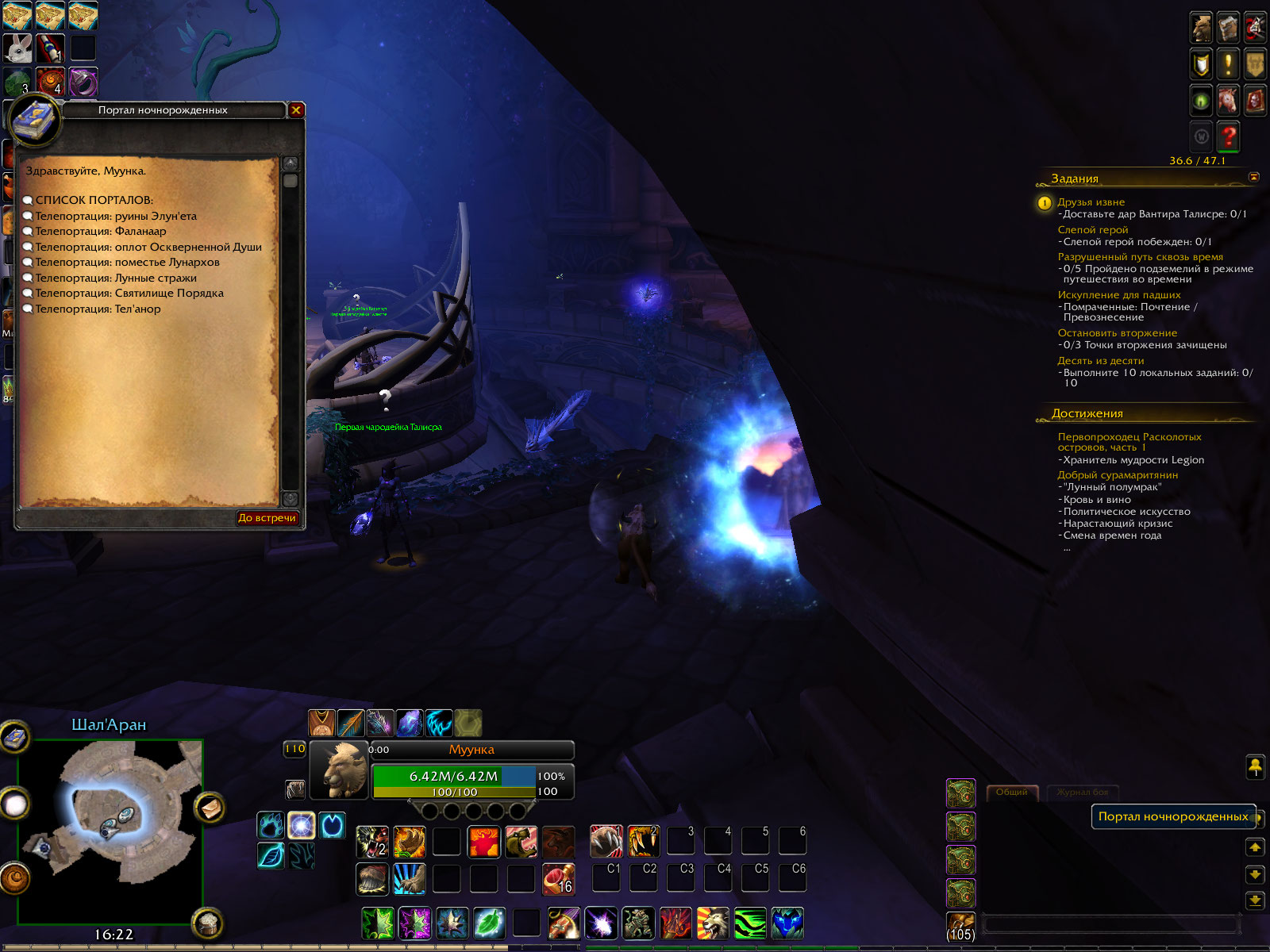 Такая же проблема. Появилась тоже в конце апреля. Первый персонаж, других линеек в Сурамаре не начинал. Отмена квеста не помогла, релоад предыдущих квестов у О`Ши в Даларане - тоже. Сдан квест https://ru.wowhead.com/quest=44051 Монолог Талисры есть анимация тоже, а бутылка остается у меня в инвентаре. скрин 1. Портал в "Лунный полумрак" появился в комнате порталов, но его нет в списке выпадающем из портала перед мостиком. скрин 2. Верина и Корина стоят в городе у портала "Лунный полумрак". |