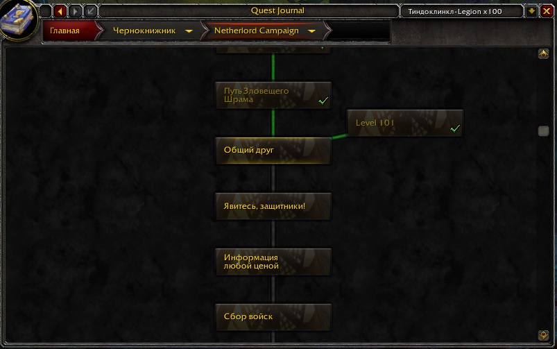 slipoint Открываешь аддон, в аддоне выбираешь кампанию оплота и он тебе сразу покажет какие квесты успел сделать, а какие еще нет. Делаешь скрины на одном чаре и на втором, так чтобы было видно квест, который последним был выполнен. И тестер сразу же подскажет куда бежать и что делать. Без скриншотов , на которых видно что предыдущий квест выполнен, а следующий за ним не дают НПС никакой помощи не будет. Хотя одну вещь могу подсказать. Не все квесты на артефект начинаются / выдаются/продолжаются в оплоте. И вторую вещь - есть такая штука как https://ru.wowhead.com/ ,а на вовхеде есть описание и цепочек квестов оплота и цепочек квестов на получение артефактов. |
