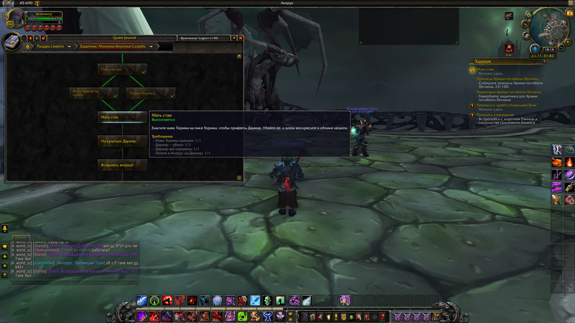| Description | после прохождения цепочки по квету "Мать стаи" попал в Акерус ,но там нет Дариона Моргрейна ,которому нужно сдать квест(скрин) реалм Легион х100 персонаж Брантимор | ||||