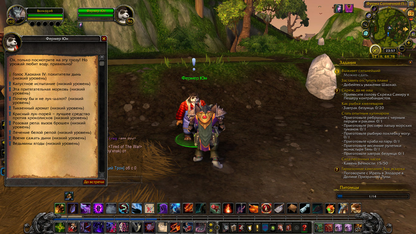 https://ru.wowhead.com/quest=31372/%D0%B7%D0%B5%D0%BC%D0%BB%D0%B5%D0%B4%D0%B5%D0%BB%D1%8C%D1%86%D1%8B#english-comments или сразу https://ru.wowhead.com/quest=30252/%D1%80%D1%83%D0%BA%D0%B0-%D0%BF%D0%BE%D0%BC%D0%BE%D1%89%D0%B8 у https://ru.wowhead.com/npc=58721/%D1%84%D0%B5%D1%80%D0%BC%D0%B5%D1%80-%D1%8E%D0%BD 58721 Квест 30252 сдается другому Юн 58646, у которого уже и начинается вся цепочка После сдачи квеста и небольшого по сценарию диалога, у Фермера Юна будет доступна цепочка заданий: Растениеводство I: семена Растениеводство II: грядки и семена Растениеводство III: уход за овощами Растениеводство IV: сбор урожая Растениеводство V: рынок Полугорья Растениеводство VI: голос Джины |