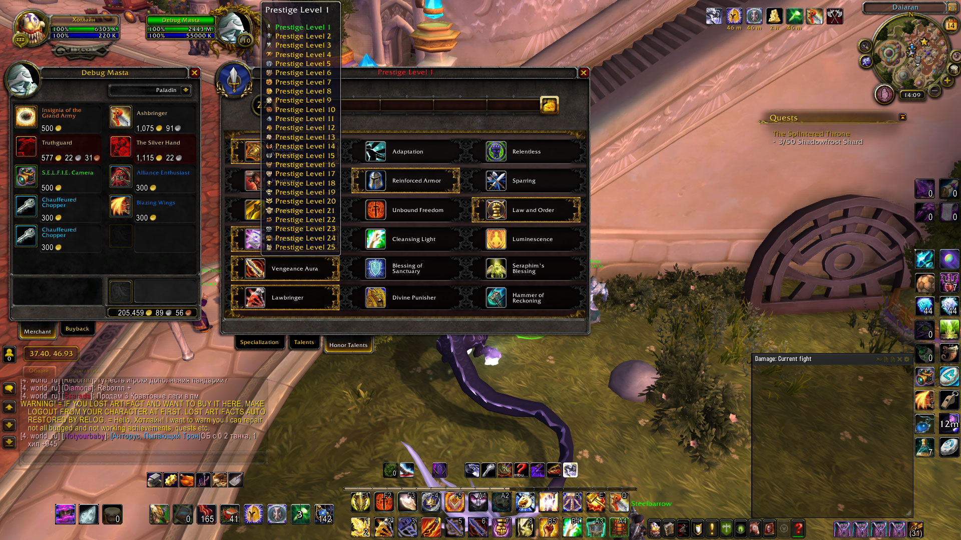 Я же говорю, был у меня облик за 1-ый престиж уже. Я получал на 50-ом уровне чести квестовый предмет и выполнил квест месяца 3 назад наверное. На скрине видно, что у меня есть 1-ый уровень престижа и открыты все PvP-таланты. На скрине первого комментария тоже видно, что у меня открыты все таланты и уже набираются уровни чести на пути ко 2-ому уровню престижа. У Дебагера проверил id достижения и квеста, пишет не засчитано, но я помню что я всё это получал уже и облик у меня был. |