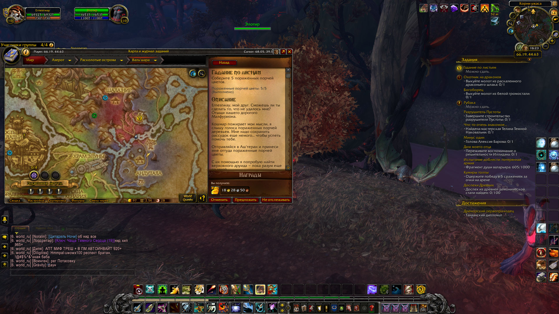 | Description | Невозможно сдать квест https://ru.wowhead.com/quest=38684/гадание-по-листьям. Квест должен сдаваться нипу https://ru.wowhead.com/npc=92783/элотир но значок сдачи квеста находится в другом месте, где еще и нет никаких нипов. | ||||