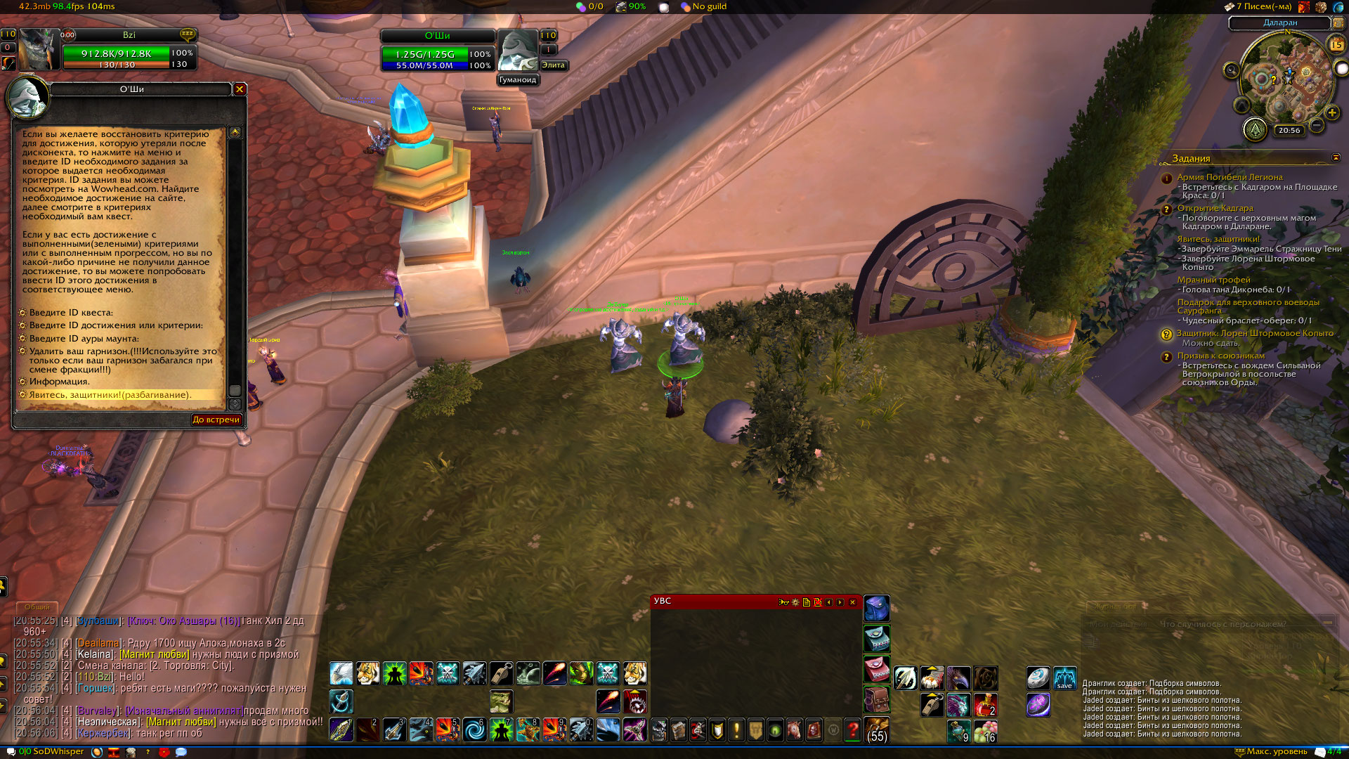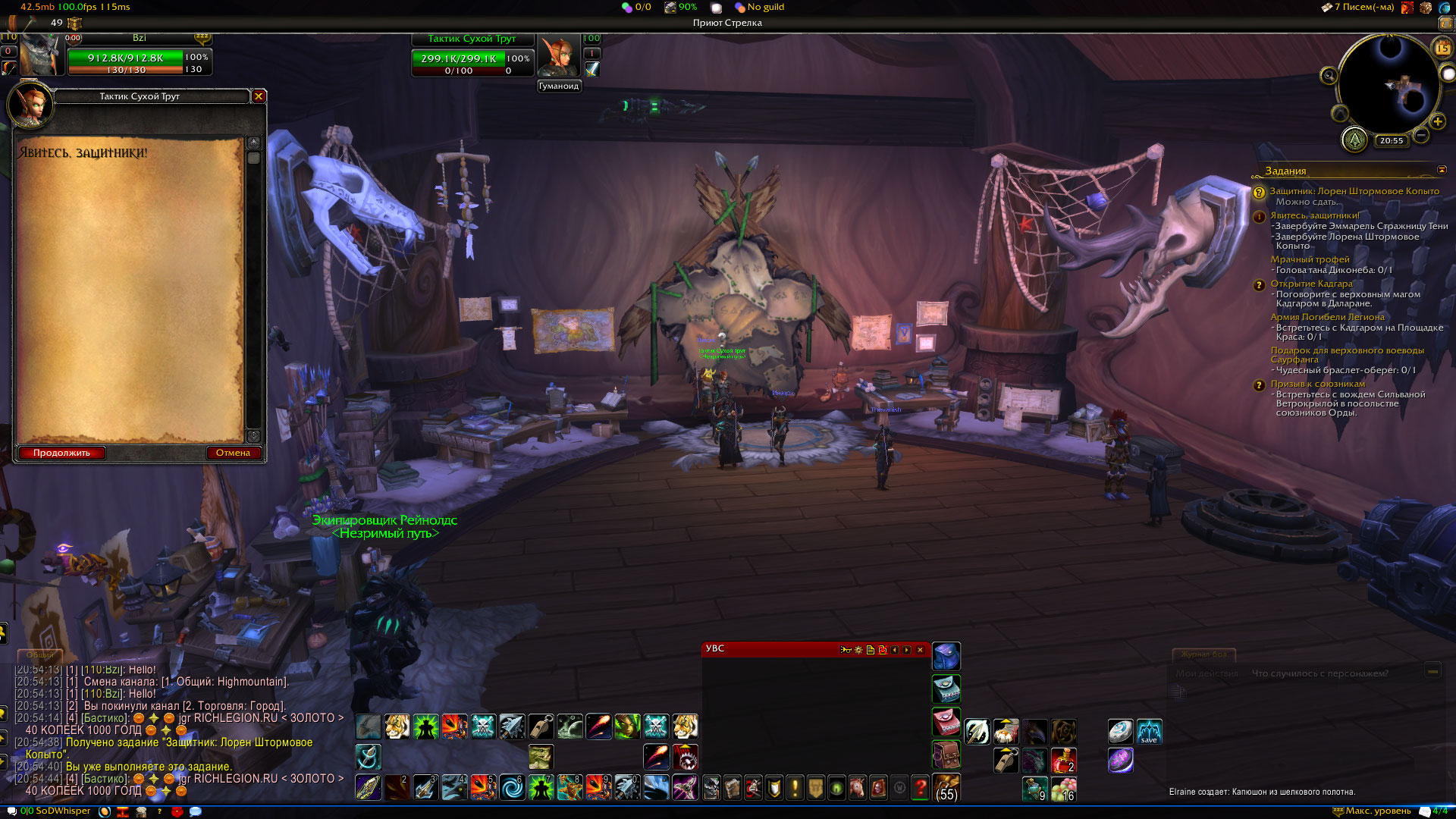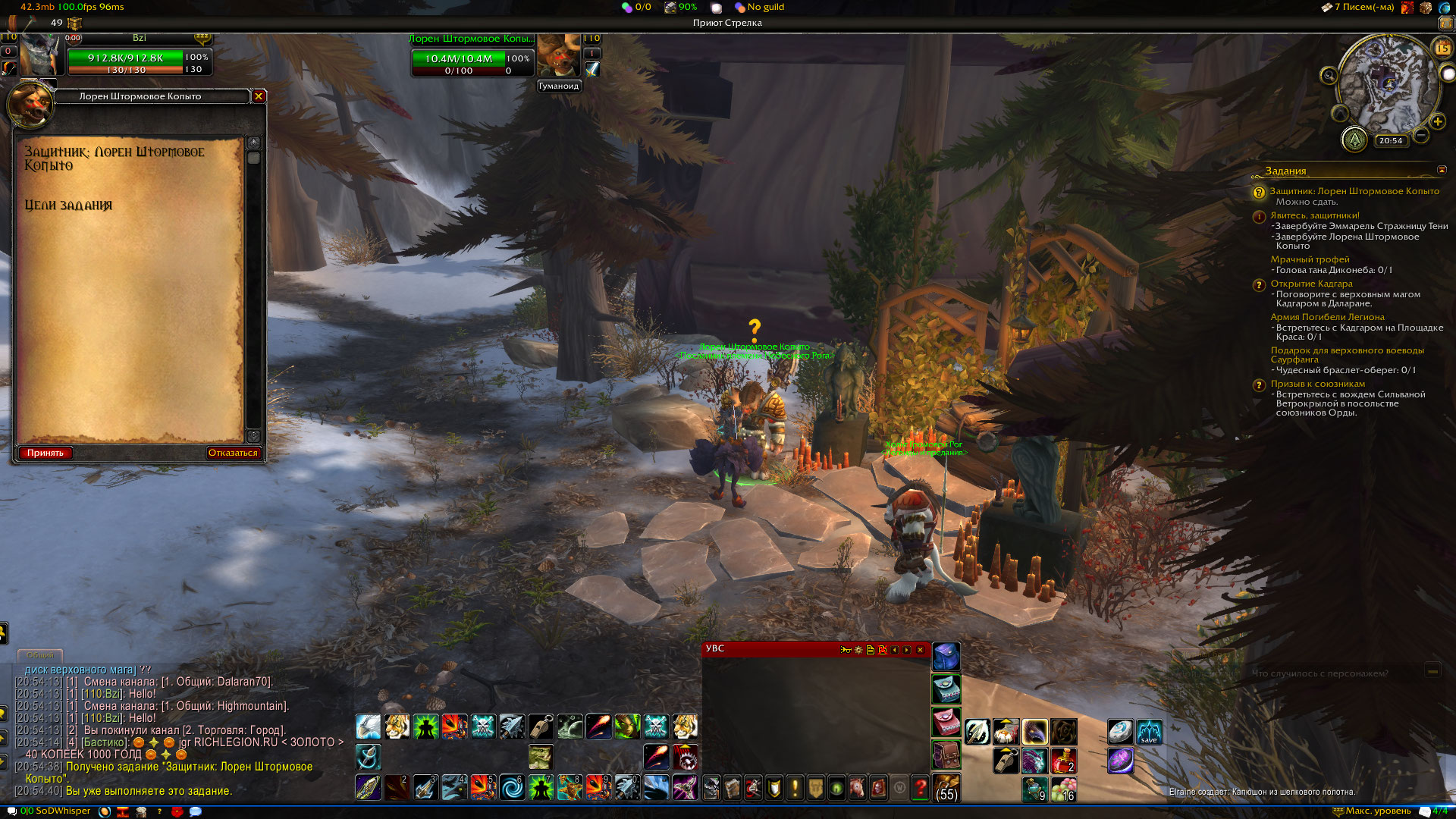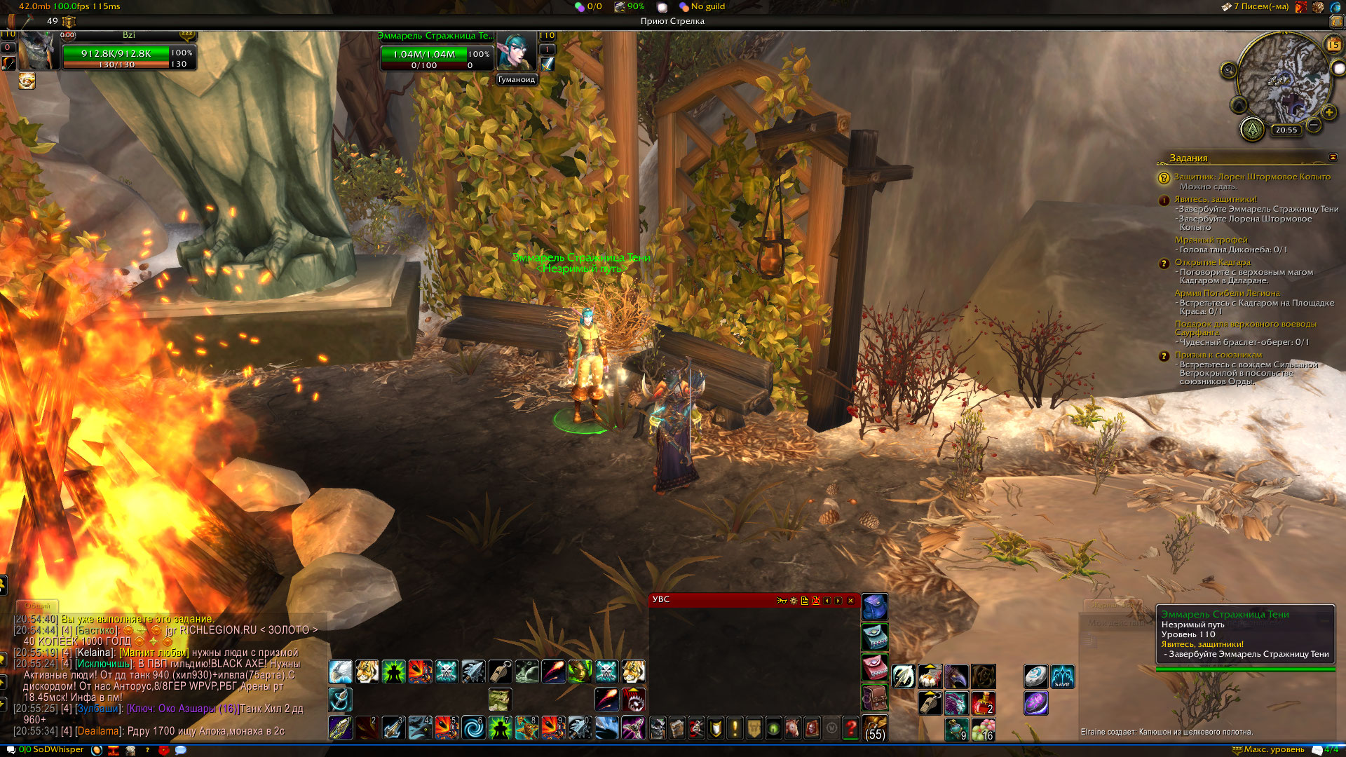 Подтверждаю, квест не работает! Ник в игре Bzi, ММ хант. у О"Ши не засчитывает. Делал так: сперва получил квест, пошел к Эммарель Стражница Тени выполнил квест, часть засчитало. После пошел к Лорену Штормовое Копыто, взял квест Защитник: Лорен Штормовое Копыто, пробую сдать его, пишет "вы уже выполняете это задание" и не сдается квест. Пробовал отметь и заново брать, чистил кеш в итого не помогло ничего. В итоге отменил Явитесь, защитники! и теперь Эммарель Стражница Тени не зачитывается, хотя подсвечивается. Что нам делать ?! Читал баг репорты, в январе были проблемы с этим квестом, писали что исправили, а получается что нет. Если нужно, есть видео: https://youtu.be/wpmLEBVKSEw |