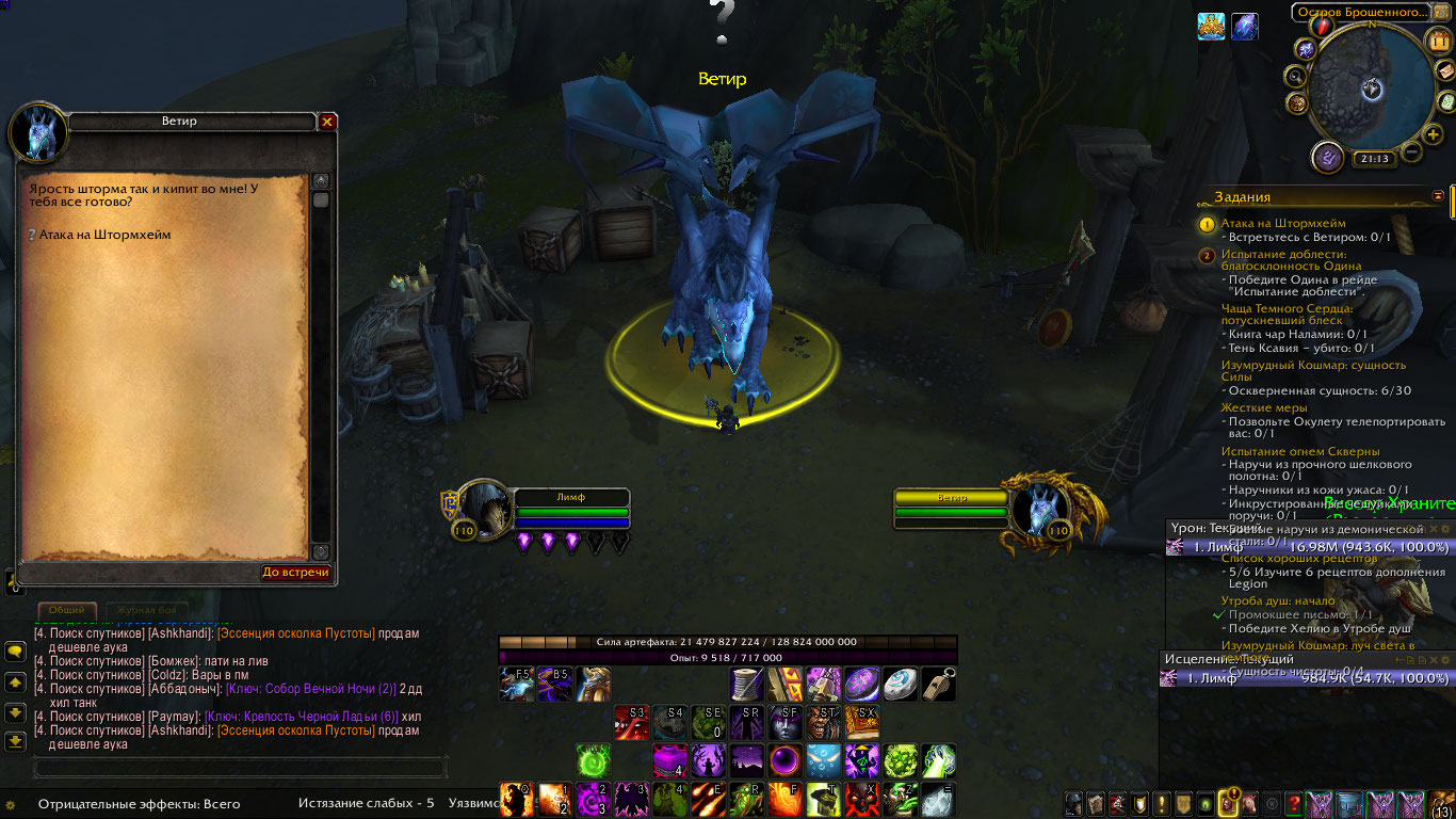 Подвигаться , круги вокруг него понаматывать. Срабатывает датчик приближения к Ветиру и квест засчитывается. Его можно сдать. Сразу же появляется еще одно автопринятое задание "Атака на Штормхейм" с прогрессом 0/4. И после получения следующего задания "Неистовство шторма" , полета на драконе и добивания мобов вручную появляется валькира, ставит щит и... исчезает. Знак вопроса на радаре показывает на пустое место. Квест считается выполненным но сдать его некому. Ранее, как только ввели атаку Легиона на Штормхейме, валькира тупо стояла на месте и сдать этот квест ей не получалось, кнопка не срабатывала. Сейчас же и валькира пропадает. По факту ивент выполнить невозможно, либо нужно пройти по тонкой грани и тщательно выполнить некие неизвестные критерии. Скринов нет, поскольку не планировалось создавать задачу. Сервер ЭпикВОВ, х1, в настоящее время проистекает данная атака Легиона, можно по горячим следам глянуть как оно там. |