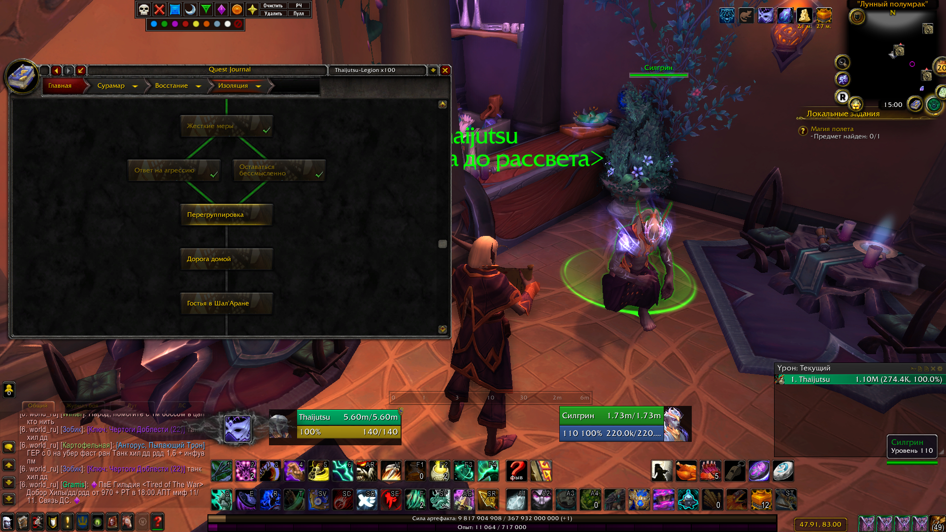 | Steps To Reproduce | Оставаться в живых бессмысленно прошёл, эвакуировал выживших из "Лунного мрака" и Дозора сирены, дальше нужно было следовать за Силгрином, так и сделал, дошёл до момента когда телепортироваться на верхнюю точку, но после нескольких попыток, пункт "Следовать за силгрином" не сдавался, после трёх попыток, отменил квест и теперь вообще не могу ничего сделать, квест вообще пропал и не могу взять по новому | ||||