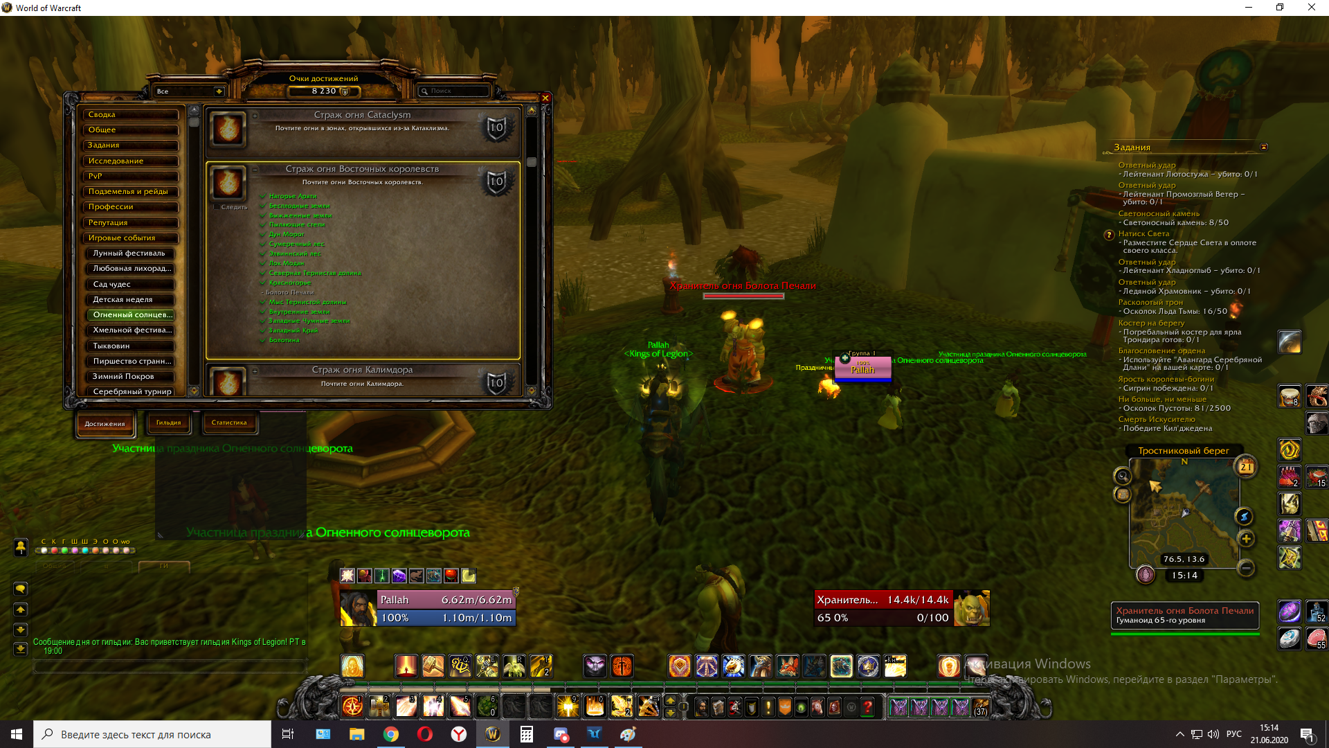 Здравствуйте.Нпс https://ru.wowhead.com/npc=51602/страж-огня-болот-печали находится в другом месте, по координатам в аддоне TomTom 70.25 15.66 Болото Печали засчитывается в достижении http://egammi.net/image/SeGM |