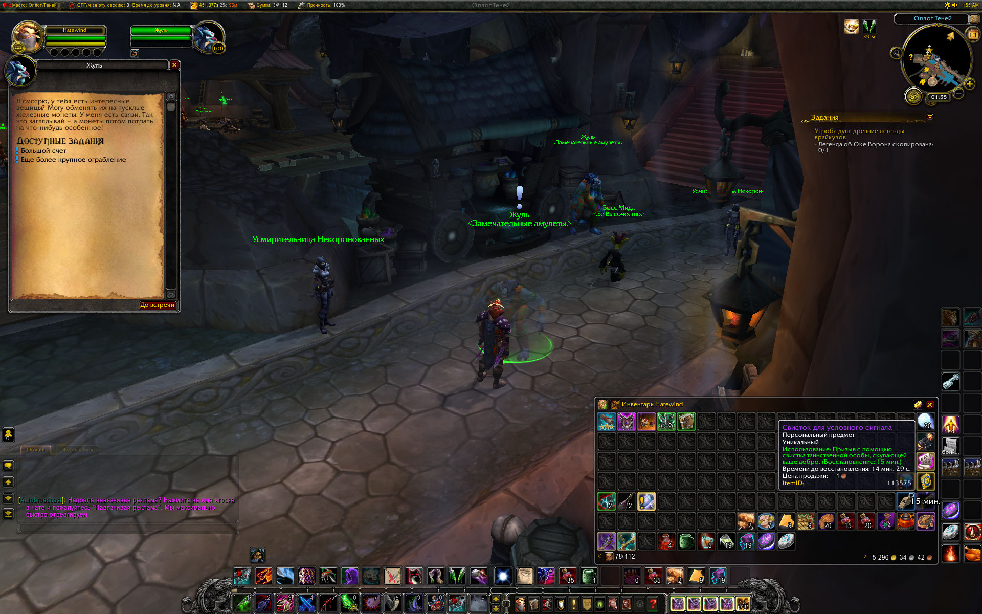 | Description | в дополнении WoD для разбойника введен способ получения голда, косметических предметов, игрушек и иллюзий Обшариванием карманов в локациях Дренора добывается https://ru.wowhead.com/item=113575/ (можно добыть) посредством которого призывается Таинственная особа https://ru.wowhead.com/npc=83006/%D0%B6%D1%83%D0%BB%D1%8C#videos-english у которого в диалоге должны присутствовать два квеста, диалог обмена и окно торговли. На видео с вовхеда видны диалоги этого НПЦ. У нас (ЭпикВОВ х1) НПЦ призывается, но в диалоге у него только два квеста по обмену тусклых железных монет на голд - еженедельный и повторяющийся. Строка обмена предметов на валюту и окно торговли отсутствуют. Уворованные предметы с тегом "карманная кража" накапливаются в инвентаре, выбрасывать жаль, поскольку их нужно обменять на вкусняшки. | ||||