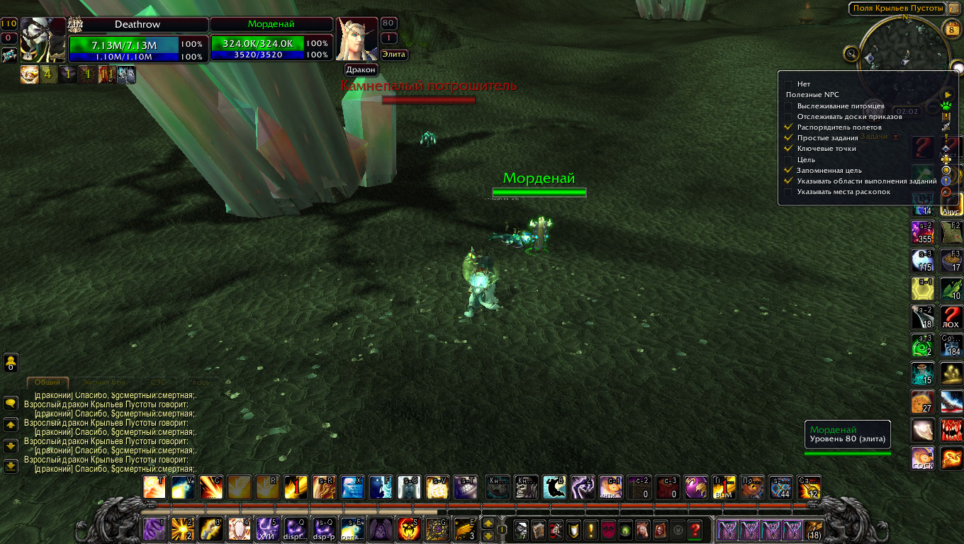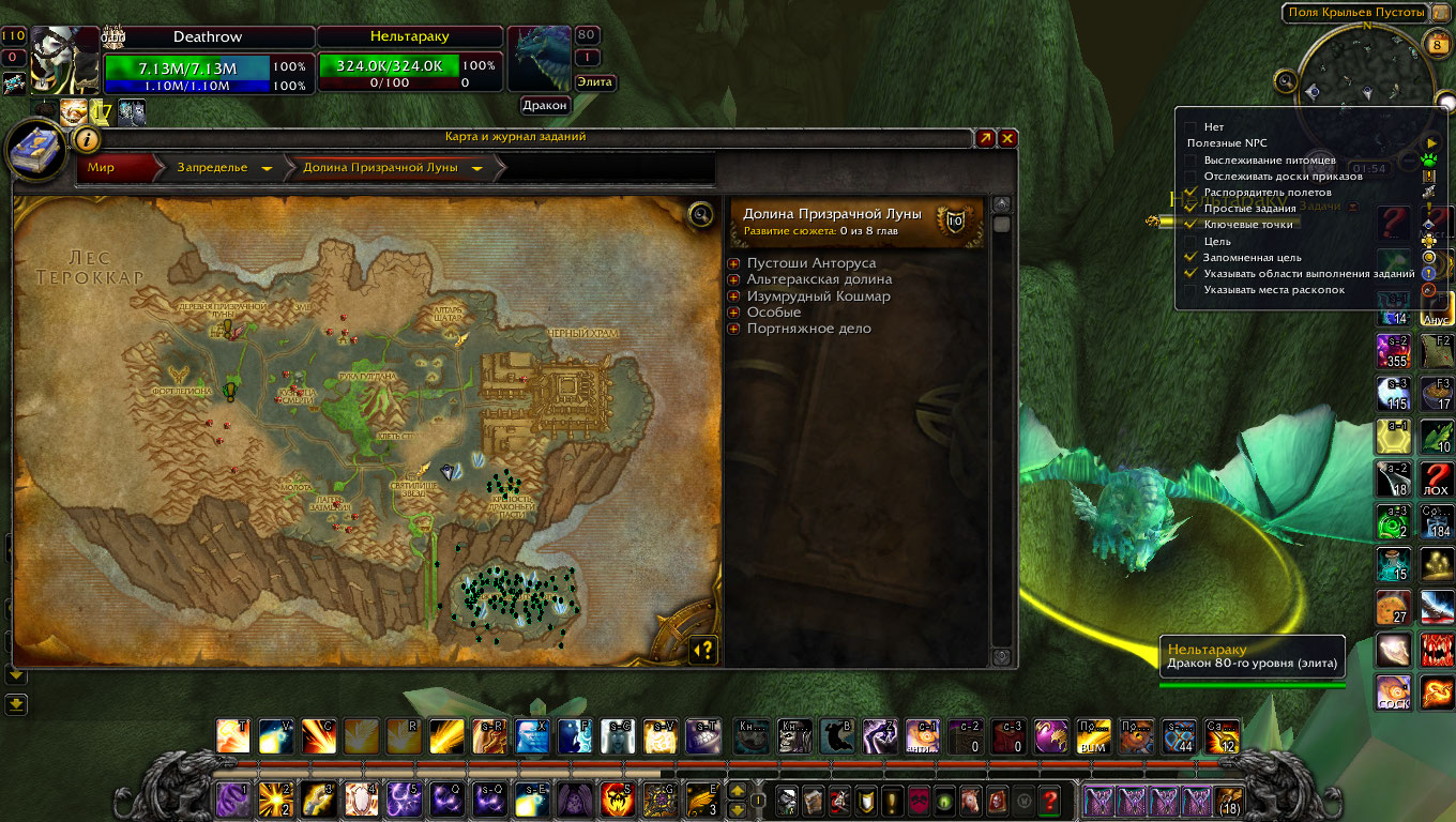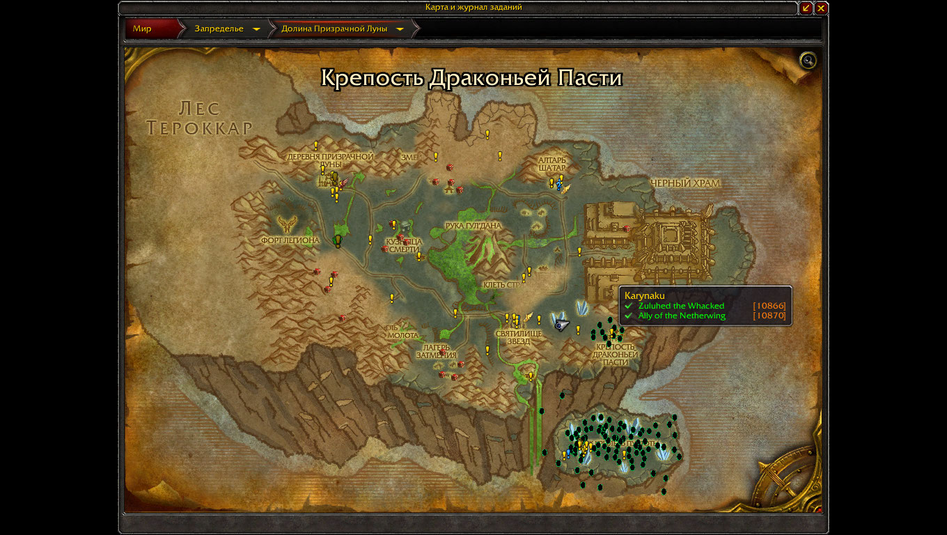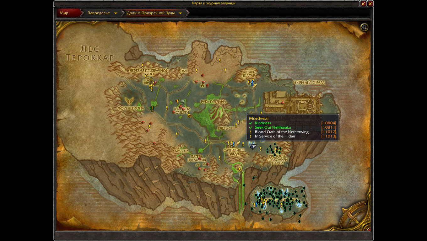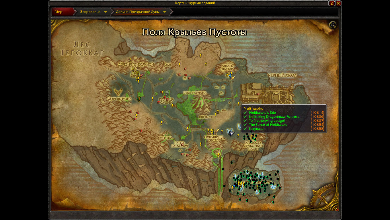 Цепочка рабочая, превознесение у крыльев пустоты получено в конце июня. Надо учесть что для прохождения цепочки требуется предварительно изучить быстрые полеты. С Вашим 110м уровнем нужно обязательно включить отображение на радаре простых (лоу-лвл) заданий. Если Вы откроете страницу с вовхеда с квестом https://ru.wowhead.com/quest=10804 , то справа под параметрами задания Вы увидите две последовательности квестов - сюжетки Призрачной луны и сюжетки Крыльев Пустоты - последовательности квестов верхней и нижней могут не совпадать, поскольку в одной из цепочек могут присутствовать дополнительные квесты, которых нет в другой цепочке. Установите аддон QuestCompletist Version: 109.5 - на наших серверах он приемлемо показывает состояние квестов и разбрасывает значки на карте. Возможно Вам будет интересно выполнить и сюжетные квесты Долины Призрачной луны Запределья для ХМ. Все равно надо будет чем то убивать время пока ресаются драконьи яйца для ускоренной прокачки репутации. |