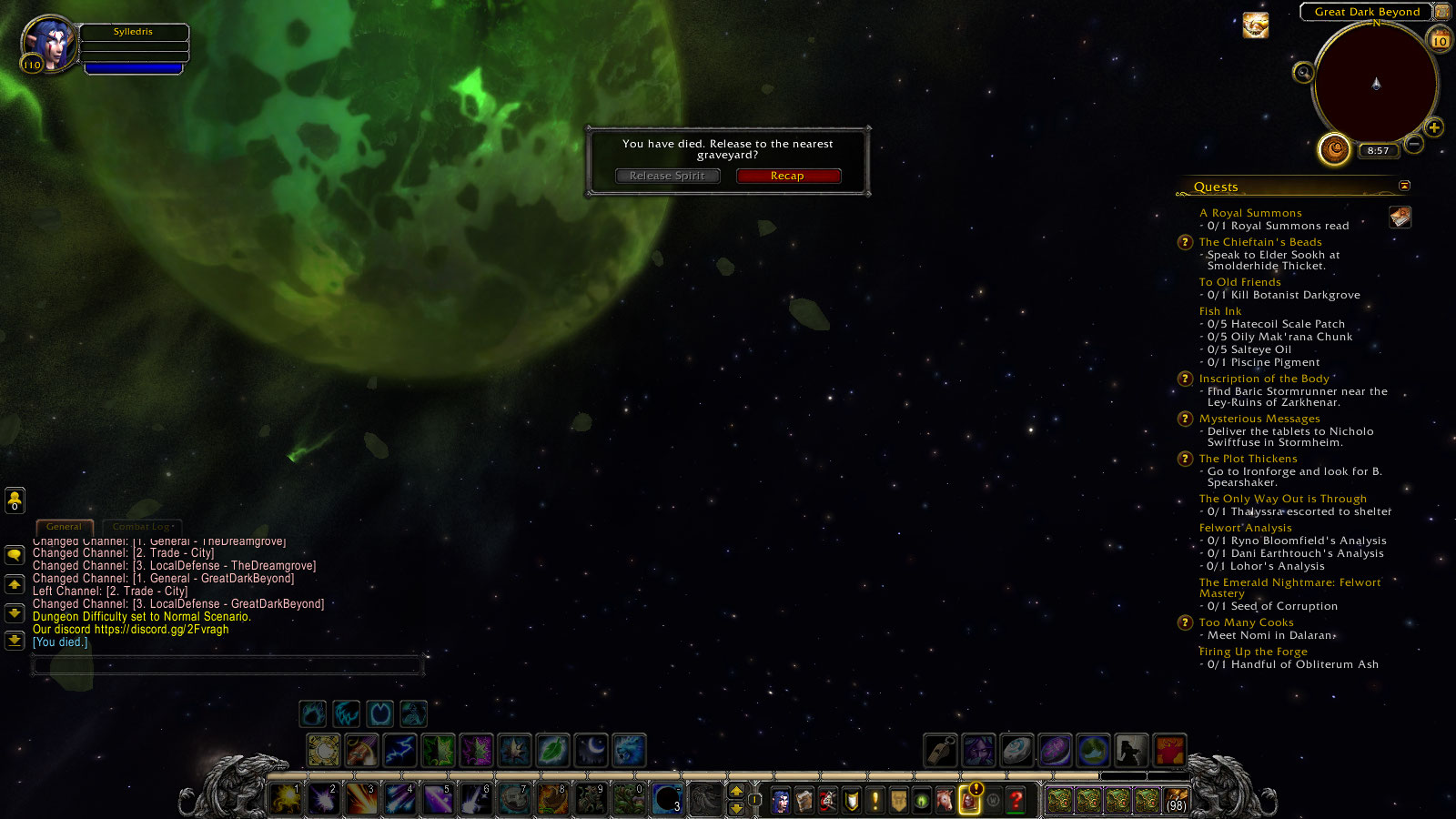 | Description | Attempting the quest https://www.wowhead.com/quest=44448/in-the-house-of-light-and-shadow yields the following result, at least as a Druid: Interacting with Light's Heart Using the Tears of Elune teleports the player to the Great Dark Beyond. This much is normal. However, instead of triggering a cutscene with https://www.wowhead.com/npc=113763/xera , you simply fall to your death and are unable to release spirit. The only way to get out of this situation appears to be by closing the game via the computer's operating system (as opposed to the "exit game" or "logout" buttons in the options menu which don't work in this situation). Once the game has been launched once again, you find yourself alive but in the Dun Morogh Workshop Entrance. I attempted this quest three times, each time yielding the exact same result. | ||||
