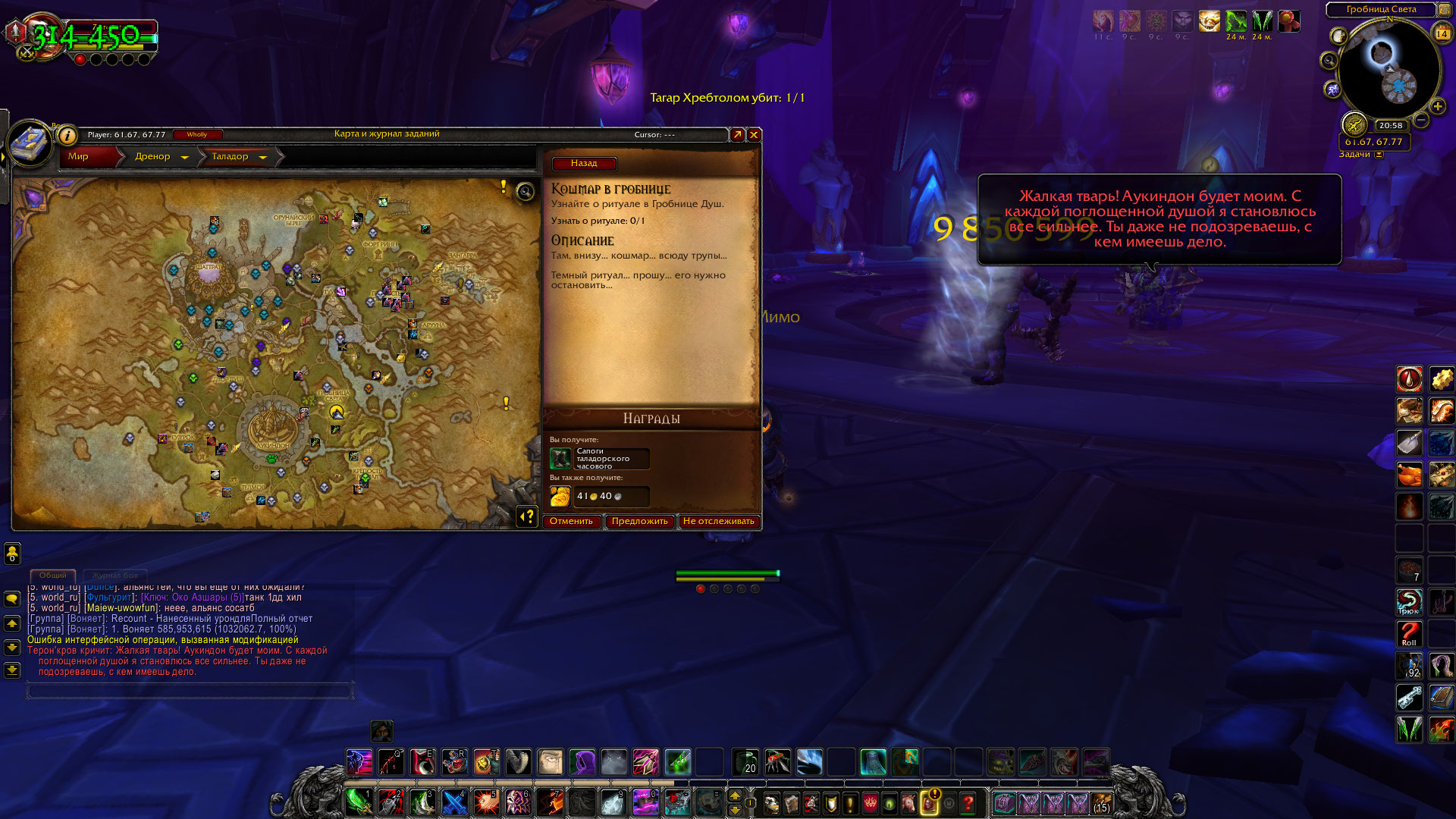 | Description | 1. Квест - https://ru.wowhead.com/quest=33530/%D0%BA%D0%BE%D1%88%D0%BC%D0%B0%D1%80-%D0%B2-%D0%B3%D1%80%D0%BE%D0%B1%D0%BD%D0%B8%D1%86%D0%B5#english-comments 2.Данный квест ялвляется обязательным к прохождению , для открытия полетов на Дреноре . Проблема заключается в том , что квест имеет 2 этапа . Этап первый - Узнать о ритуале , и этап второй - Убить моба , что стоит чуть дальше по коридору . Этап номер один , не засчитывается ни при каких условиях . Данная проблема лично у меня уже 3 дня , квест не поддается прохождению . Убив моба для завершения второго этапа квеста , его прохождение не засчитывает . Заметка ; Все находящиеся мобы в гробнице , имеющие статус Агрессора - Получают мелкий и постоянный урон из неоткуда и по истечению времени умирают . После респауна , ситуация повторяется . 3.Legion x100 / Zoroaster (Rogue) 14.07.2020 4. Скриншот ниже Если существует возможность перескочить данный квест, и пройти дальше сюжетную линию с помощи ГМа , буду очень признаетелен если со мной смогут связаться . С великим не терпением , Панда , которая поселилась в гробнице ! | ||||