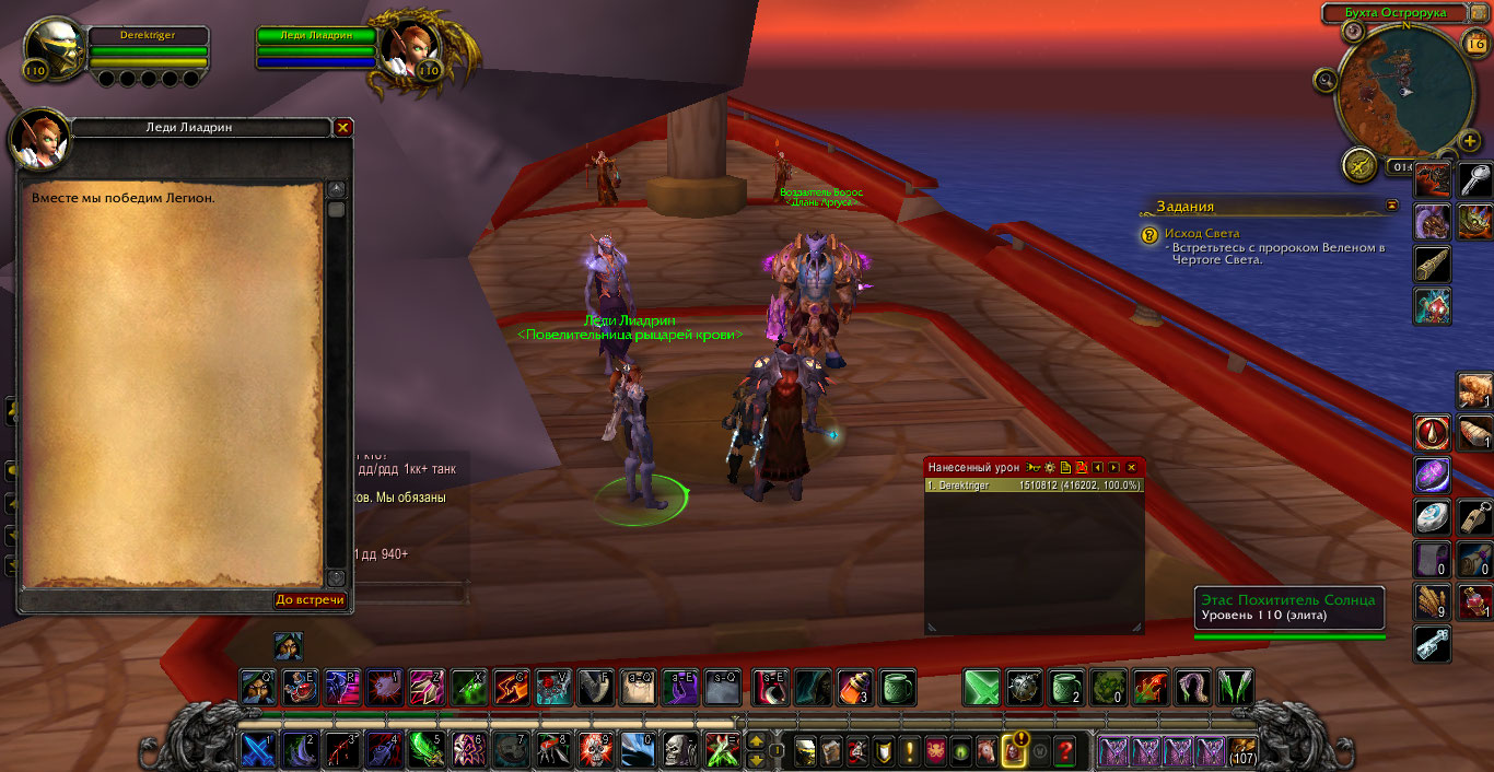 Ткните в ссылку квеста в комментарии Eurus. Справа Вы увидите последовательность квестов, в том порядке, в каком они должны выдаваться. Отмените квест Исход Света. Выйдите из игры, почистите кеш, сделайте исправление персонажа в личном кабинете. Зпйдите в игру. Если у Лиадрин нужный квест не появится - пишите на форум forum.uwow.biz в тему http://forum.uwow.biz/topic/280469-problema-s-hranitel-mudrosti-legion-kvestami-na-r/ Обратите внимание - (текст с форума) Важно! Шаблон для оформления вашего поста: Ник игрового персонажа. Ссылка с http://ru.wowhead.com/ на проблемный квест (обязательно) Описание сложившейся ситуации. Скриншоты подтверждения ваших слов. Их следует загружать на http://egammi.net/ и прикреплять к сообщению ссылками. ВАЖНО! Мы не оказываем помощь по постам, оформленным некорректно! Мы удаляем посты игроков, которые оффлайн 7 дней и более! |