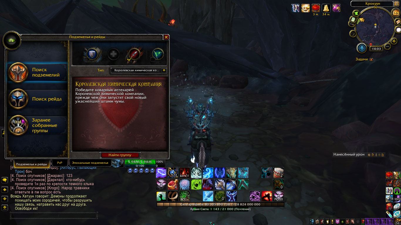 | Description | При реге в хим. компанию танком сразу закидывает в инст без пати, в одиночку. У меня 3 персонажа, которыми можно регнуть с ролью танка: 2 в Орде и 1 в Альянсе, на Альянсе такой проблемы нет, а на Орде у обоих персонажей. При реге за дд/хила на Орде больше часа висит поиск с отображением 3 дд и хила Таким образом на Орде сейчас можно пройти хим. компанию только танком и только если он может пройти в соло | ||||