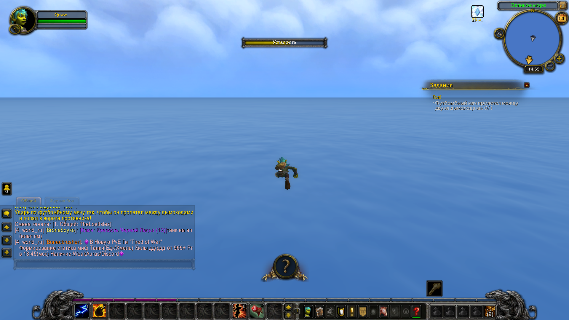| Description | Решила начать играть за гоблина, вроде всё хорошо с мелкими багами. Но как хотела выполнить квест "Гол!", то что-то странное стало происходить. Меня выкинуло на затерянные острова в великое море, как села в машину для закидывания мяча (до этого садилась с этим же квестом, всё нормально, но я НЕ могла выполнить квест сколько бы раз не кидала мяч!) (фото есть как фиг знает где появилась, тело на карте не обозначается от слова совсем) Что делать с квестом и как вернутся? | ||||