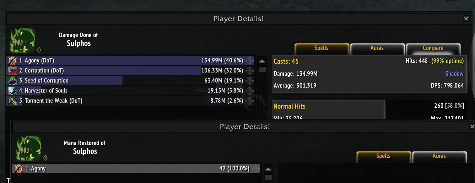Looking at 3 targets now. Official retail logs, Nighthold Botanist. Time window zoom for when all 3 bosses are active, and NO Agonies applied to other adds. https://www.warcraftlogs.com/reports/bRVNjQd69gGvXpBr#fight=1&type=damage-done&source=16&start=160166&end=207885&ability=980 (99 P) https://www.warcraftlogs.com/reports/bRVNjQd69gGvXpBr#fight=1&type=resources&source=16&start=160166&end=207885&spell=107 (9 O) 9.1% https://www.warcraftlogs.com/reports/rtd9MBk1QajA48Hw#fight=8&type=damage-done&source=1&start=3898878&end=3960945&ability=980 (135 P) https://www.warcraftlogs.com/reports/rtd9MBk1QajA48Hw#fight=8&type=resources&source=1&start=3898878&end=3960945&spell=107 (14 O) 10.4% https://www.warcraftlogs.com/reports/HB3pDWM6Nbq41FLx#fight=20&type=damage-done&source=4&start=2823969&end=2897392&ability=980 (168 P) https://www.warcraftlogs.com/reports/HB3pDWM6Nbq41FLx#fight=20&type=resources&source=4&start=2823969&end=2897392&spell=107 (16 O) 9.5% https://www.warcraftlogs.com/reports/aW2KN3thfHdrYZgw#fight=9&type=damage-done&source=1&start=1221187193&end=1221262315&ability=980 (156 P) https://www.warcraftlogs.com/reports/aW2KN3thfHdrYZgw#fight=9&type=resources&source=1&start=1221187193&end=1221262315&spell=107 (15 O) 9.6% Compare against Argusx100 Details 3 targets (training dummies, see screenshot) Agony hits: 448 Agony soul shards: 42 = 9.4% So, also for 3 targets and constant Agony hits all looks fine. |