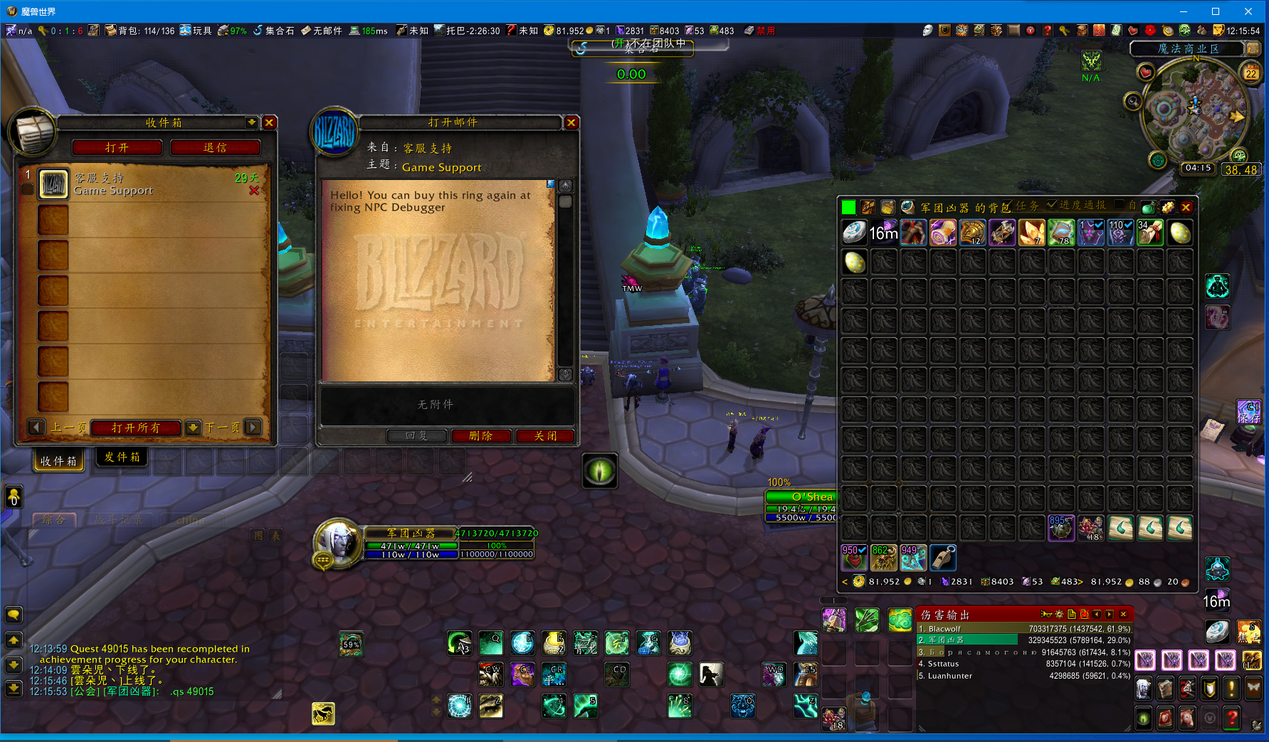 Hello. I don't consider myself a specialist, but what would I do in this case? I would wait a while, maybe game support will just mail the ring. Further. Target yourself, execute the command in the chat .q s 49015 If the quest is indeed marked as completed, and Debugger does not have the item on sale, you should contact the game server forum and try to persuade the GMs to send the item by mail or re-issue the quest. On the bug tracker, testers do not have the right to interfere with the game process and give / return anything and so on. GMs on the forum may require more compelling evidence of your correctness in this matter. (Full uncut screenshots of the execution of the command for checking the quest, the contents of the bank, bags, mail, Debugger's trade window. Actually, everything that you added in the second request should be uploaded to the photo hosting only in normal form.) It is better to immediately ask for a re-issue of the quest, GMs are reluctant recover items lost in the process of failures. |