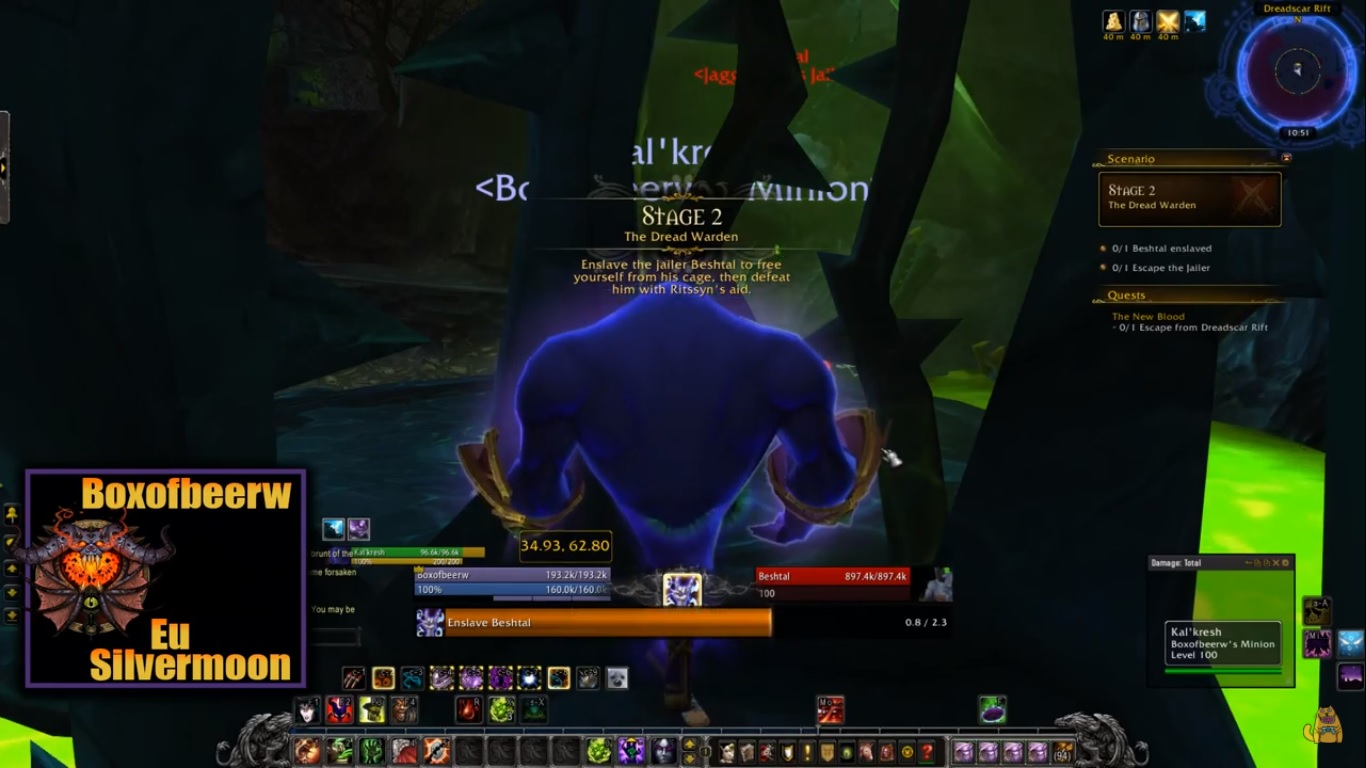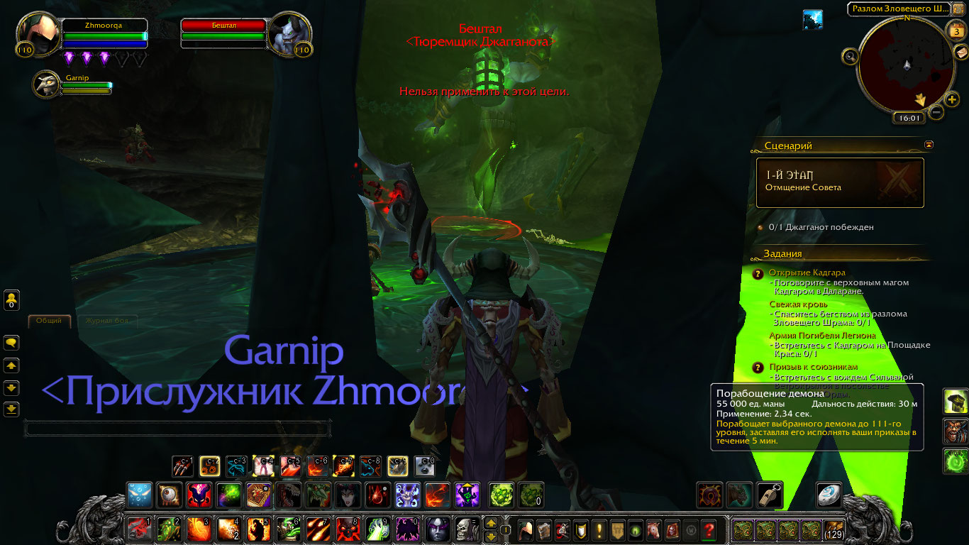| Description | Квест https://ru.wowhead.com/quest=40729/%D1%81%D0%B2%D0%B5%D0%B6%D0%B0%D1%8F-%D0%BA%D1%80%D0%BE%D0%B2%D1%8C После перемещения в клетку в Разломе Зловещего Шрама нужно поработить тюремщика Бештала, чтобы он открыл клетку. При попытке сделать это штатным спеллом чернокнижника из книги заклинаний сообщается "Нельзя применить к этой цели" (скриншот 1). Нашел в интернетах, что при выделении этого НПС должна появиться отдельная кнопка с заклинанием порабощения, как на скриншоте 2, снятом с ролика в ютьюб. Кнопка не появляется, невозможно дальше двигаться по квесту. | ||||
