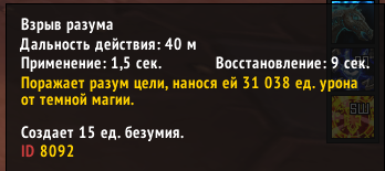 | Description | Внутри игры в окне персонажа значение основной характеристики показывается неверно. Если мы проверим по формулам урон от некоторых способностей, получим несостыковку: Стрела Бездны: 8140*2,2*1,2=21489 (https://ru.wowhead.com/spell=205448/%D1%81%D1%82%D1%80%D0%B5%D0%BB%D0%B0-%D0%B1%D0%B5%D0%B7%D0%B4%D0%BD%D1%8B#changelog) Взрыв разума: 8140*3,1=25234 (https://ru.wowhead.com/spell=8092/%D0%B2%D0%B7%D1%80%D1%8B%D0%B2-%D1%80%D0%B0%D0%B7%D1%83%D0%BC%D0%B0#changelog) Пытка разума: 8140*2,6=21164 (https://ru.wowhead.com/spell=15407/%D0%BF%D1%8B%D1%82%D0%BA%D0%B0-%D1%80%D0%B0%D0%B7%D1%83%D0%BC%D0%B0#changelog) Судя по всему реальное количество интеллекта (силы заклинаний) равно около 10к | ||||