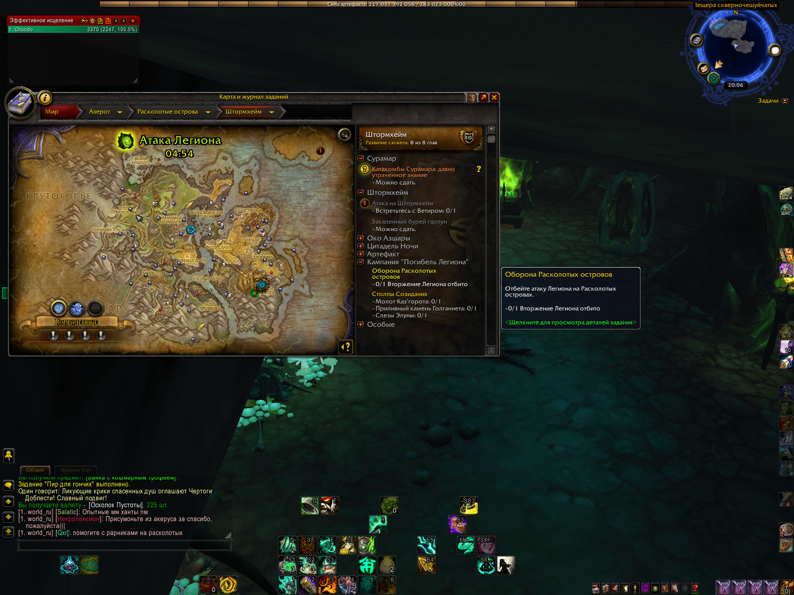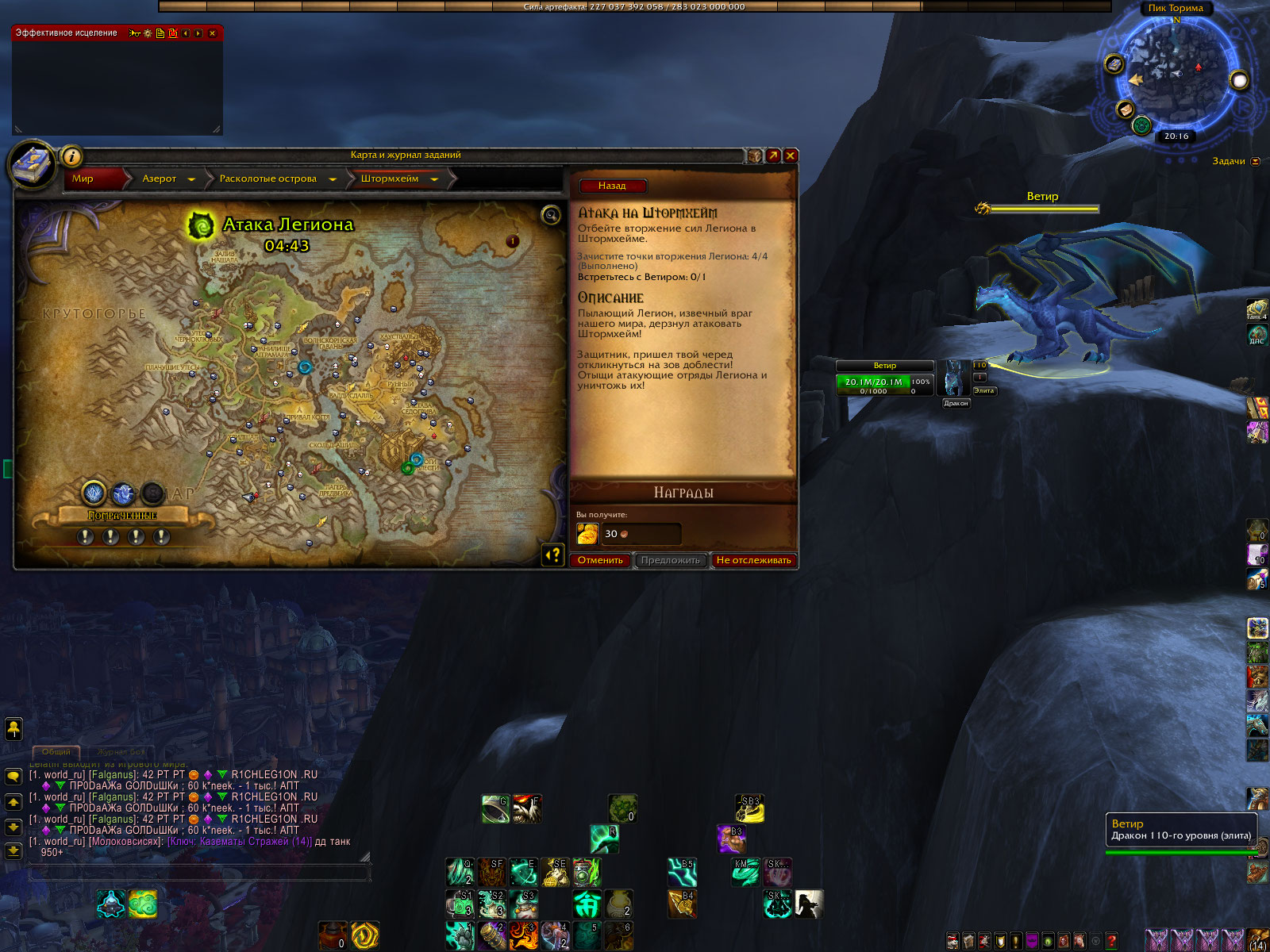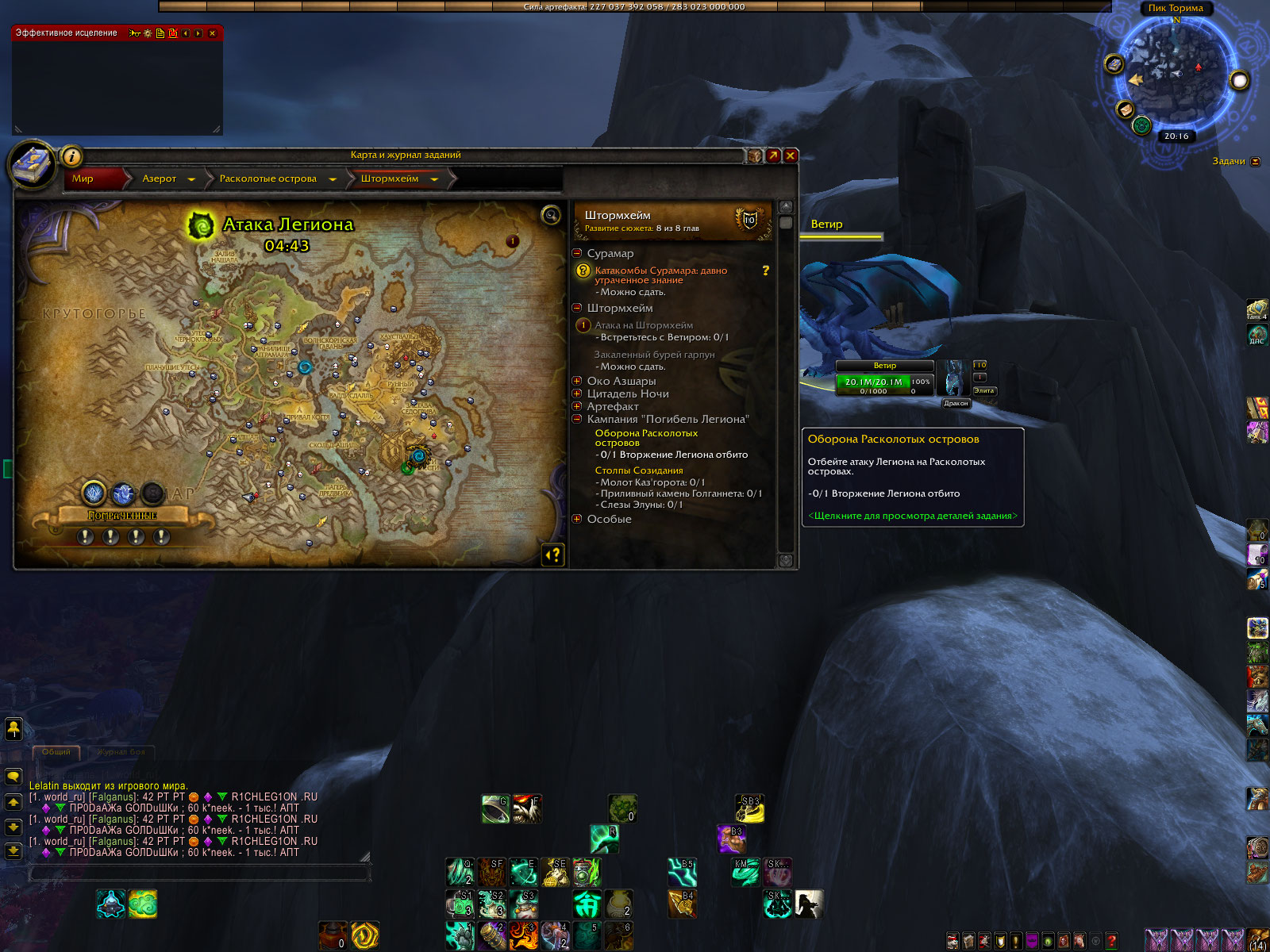 Я прощаю Вам попытку решить проблему "в лоб" :) . Видимо я плохо объяснял ранее. С другой стороны если бы я писал опосредствованно, Вы бы обиделись на меня уже по другой причине. Общая инфа: Любая атака Легиона происходит в ограниченное время, оставшееся время до завершения атаки отображается на основной карте и в счетчиках времени отдельных локалок. Любая атака Легиона происходит по разным сценариям, в завсисмости от местности, но есть и общие моменты. Эти моменты таковы: Отражение атаки Легиона выполняется в несколько фаз. А именно в три фазы. Первая - локалки. вторая - квесты. третья - финальный сценарий. Первая фаза: Вы влетаете на территорию и принудительно получаете квест : выполнить как минимум четыре локальных задания атаки Легиона (зеленых) Этот квест Вам нужно будет сдать НПС, который ответственен за координацию атаки в конкретной местности. Для Азсуны это принц Фарондис, для Штормхейма Ветир (и на последнем этапе валькира Одина). То есть - у Вас есть квест на 4 локалки. Когда Вы его выполните , на карте отобразится место, где этот квест сдавать. В случае с Штормхеймом на всех скринах, которые Вы предоставили есть кружок с цифрой "1" , расположенный на территории острова Каменного Щита. Верхний правый край карты. Также видно, что у Вас эта территория не открыта , то есть Вы там ни разу не были. А там есть птичник, он расположен на восточном краю острова и рядом с птичником на острове и встречает игроков Ветир. Там он принимает квест на 4 локалки и выдает следующий квест. Как только Вы сдали координатору квест на 4 локалки , Вы можете начать вторую фазу атаки. Для этого Вы берете следующий квест у координатора и выполняете его. В Штормхейме вторая фаза протекает на острове Каменного Щита. Нужно будет полетать на драконе, побомбить войска Легиона, выполнить несколько пунктов квеста. По выполнении всех пунктов квеста второй фазы он сдается координатору (в случае Штормхейма - валькира Одина). Затем у координатора можно взять квест на третью фазу атаки Легиона. Третья фаза всегда выполняется в группе из трех человек, в специальной локации-инстансе, типа мини-подземелья. Для участия в сценарии нужно взять квест, и после этого встать в очередь на сценарий , воспользовавшись диалогом у НПС координатора. В случае Штормхейма - повторюсь - это Валькира Одина, которой сдавали квест второго этапа. Если звезды сложились нормально и группа из трех человек была собрана системой (или игроками заранее) то игроков телепортирует в квестовое подземелье, где требуется выполнить несколько этапов сценария, которые в разных местностях построены по разному, но всегда в конце надо убить главного босса. Именно убийство главного босса и является критерием удачного отражения атаки Легиона и самого квеста. главная ошибка - Вы относитесь к атаке Легиона как к чему то сверхъестественному, на самом деле это всего лишь последовательность квестов и сценариев. Квест первой фазы отображается на карте, в журнале заданий и к нему указывает желтый маркер на радаре. Зона выполнения квестов также отображается на карте и на радаре. Потеряться можно , если не обращать внимания на обычные для ВоВ моменты. замечание - мнения мое и тестеров разделились - я считал и считаю, что если ранее выполнялась атака Легиона в какой то местности, и даже если она не была завершена, то в следующий р