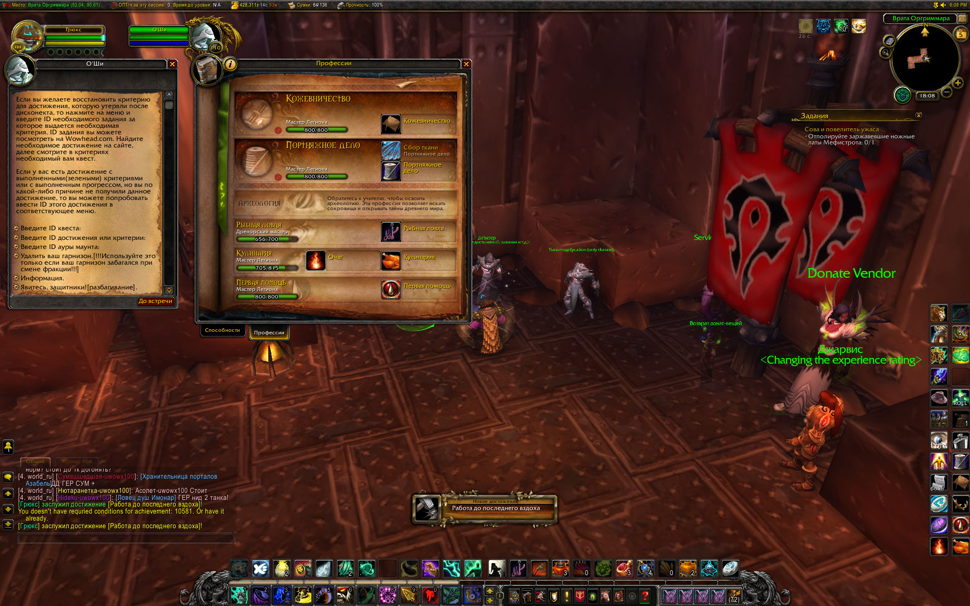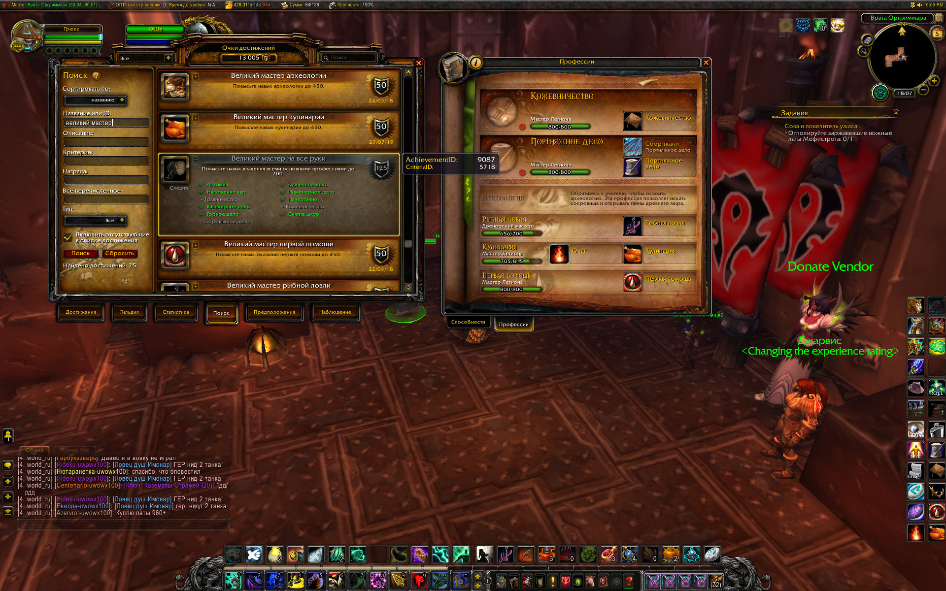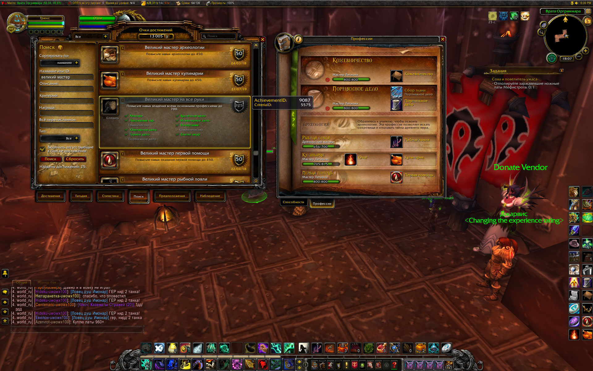 | Description | По мотивам http://tracker.legionbugs.com/view.php?id=12942 достижение https://ru.wowhead.com/achievement=9087/%D0%B4%D1%80%D0%B5%D0%BD%D0%BE%D1%80%D1%81%D0%BA%D0%B8%D0%B9-%D0%BC%D0%B0%D1%81%D1%82%D0%B5%D1%80-%D0%BD%D0%B0-%D0%B2%D1%81%D0%B5-%D1%80%D1%83%D0%BA%D0%B8 не засчитываются критерии для кожевничества, травничества и портняжного дела. При том, что эти профессии изучены до капа , в статистике достижений указывается как максимальное значение навыка число, которое берется с твинка, на котором после получения ачивки за кап 800 в профе, снова была взята эта же профессия. Цифры навыка показываются в статистике и после того, как профа была удалена на твинке, либо сам твинк был удален и создан другой персонаж. Перезачет у О`Ши достижений за 1 и 2 профессии с капом Легиона (800) происходит успешно, а попытки перезачесть критерии достижения 9087 и само достижение не приводят к успеху. Пишет, что такого критерия нет. Напишите мне, какие числа надо вводить у дебагера, чтобы перезачесть портняжное дело Дренора и портняжное дело Легиона? Напишите мне, какие числа надо вводить у дебагера, чтобы перезачесть кожевничество Дренора и кожевничество Легиона? Напишите мне, какие числа надо вводить у дебагера, чтобы перезачесть травничество Дренора и травничество Легиона? Скрины прилагаю. | ||||