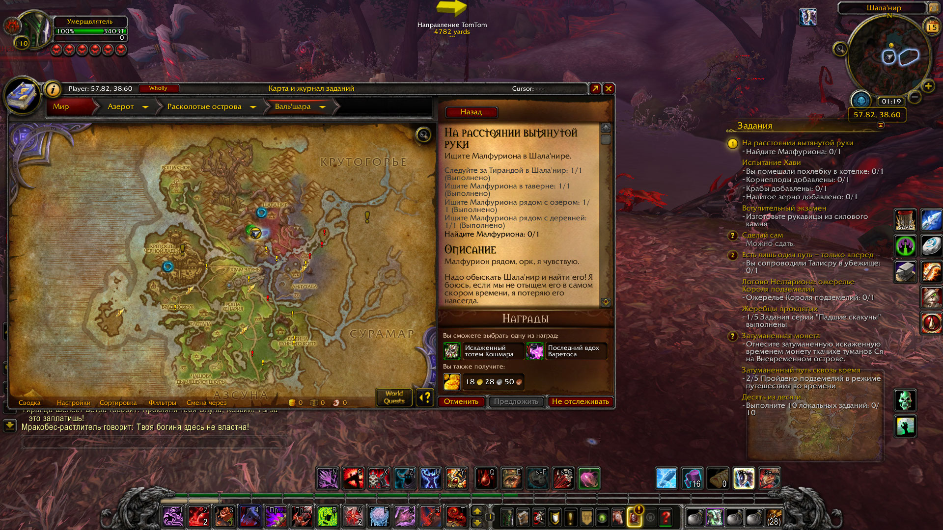 | Description | Не работает квест "На расстоянии вытянутой руки" в зоне Вальшара. Невозможно выполнить последний этап квеста "Найдите Малфуриона". Переделывал этот квест несколько раз и без результата. Тиранда произносит свою речь и потом ничего не происходит, кликнуть на нее нельзя. Иногда она исчезала после своей речи, иногда ее вообще не было на месте встречи. | ||||