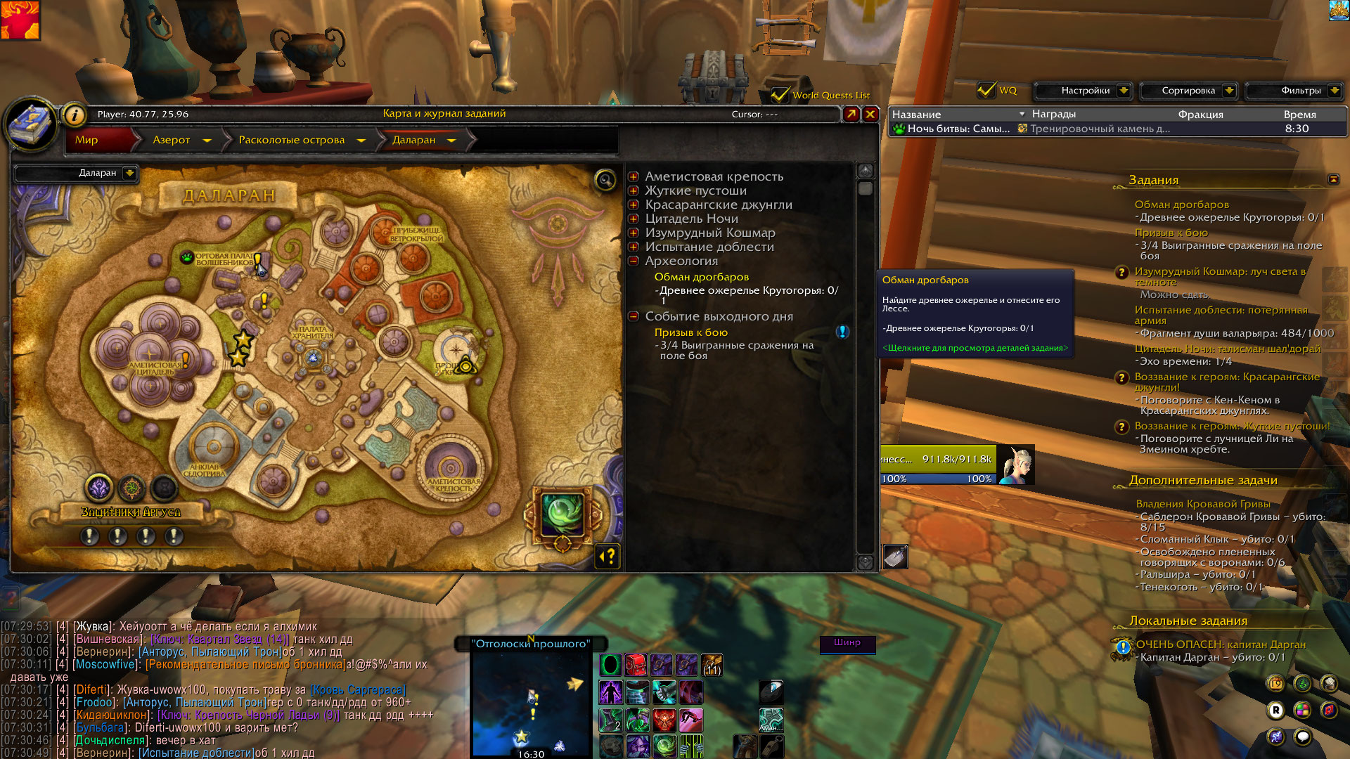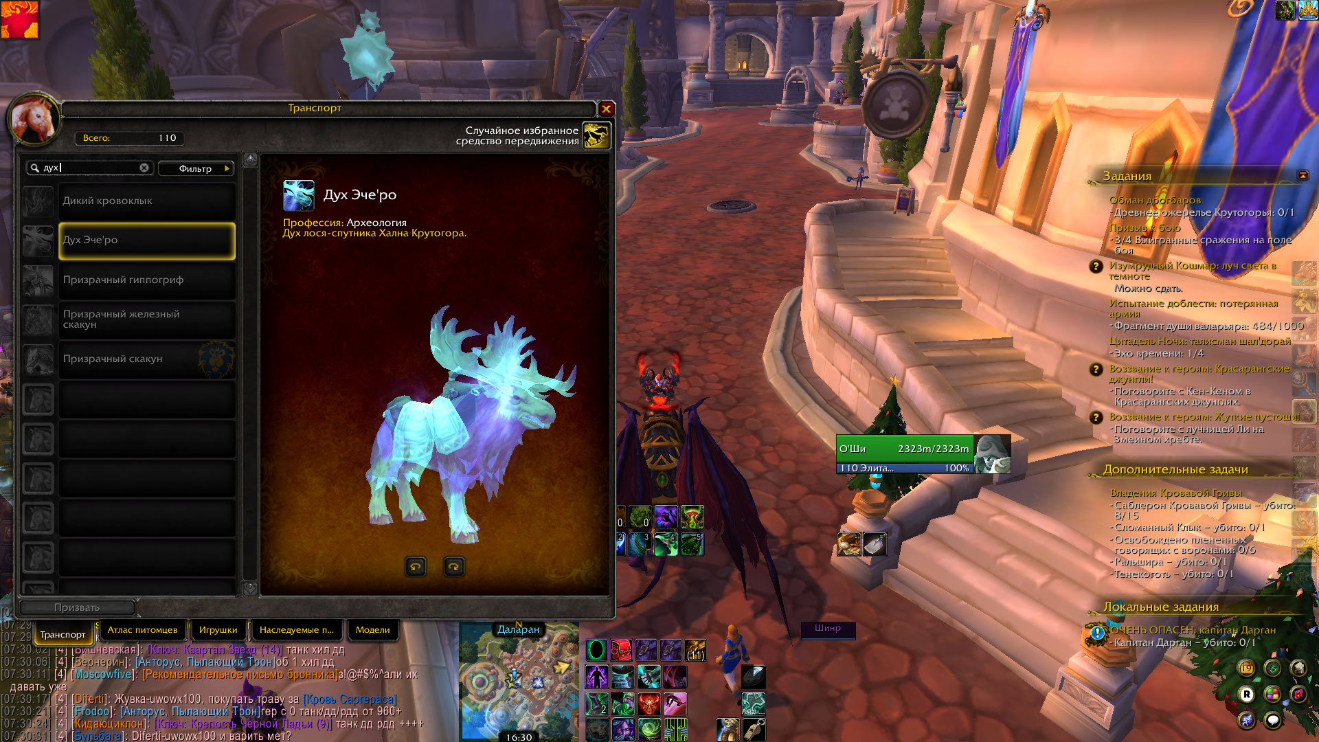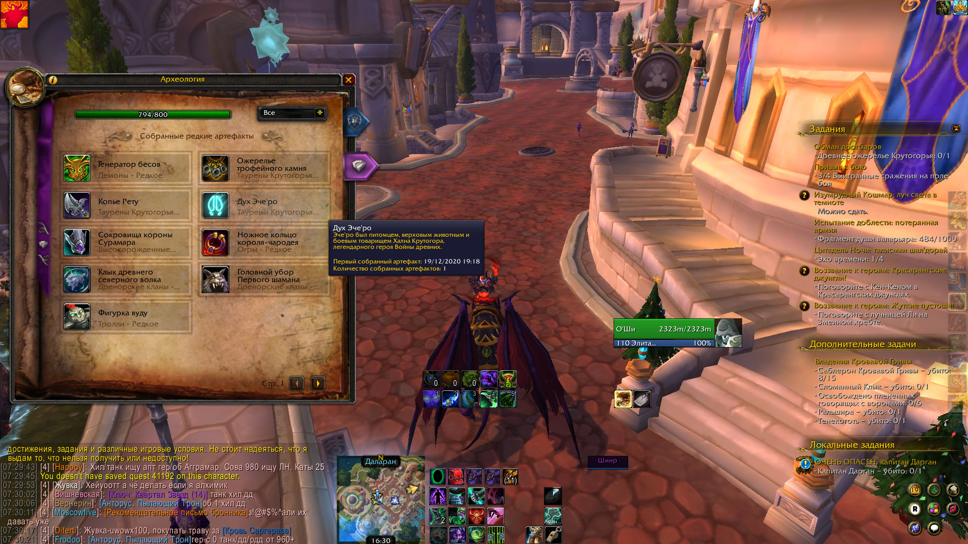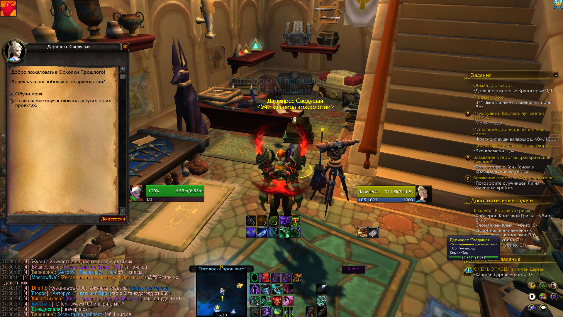 проверка. таргет на себя в строке чата команды: .q s 41192 .q s 41193 если система ответит, что оба квеста не выполнены - все Ваши усилия прилагались не в то время и не там где следует. Квесты археологии в Легионе появляются в новом Даларане у НПС https://ru.wowhead.com/npc=93538 раз в неделю (на оффе - раз в две недели) и циклически сменяются. Каждый квест - начало цепочки приключений с археологической лопатой или пулеметом в руках. Завершение цепочки - получение одного из редких артефактов Легиона. Собрать из фрагментов редкий артефакт Легиона невозможно, получить можно только выполнив квест. В частности для получения маунта нужно выполнить цепочку из двух квестов https://ru.wowhead.com/quest=41192/%D0%B2%D0%B5%D1%80%D0%BD%D1%8B%D0%B9-%D0%BF%D1%83%D1%82%D1%8C https://ru.wowhead.com/quest=41193 |