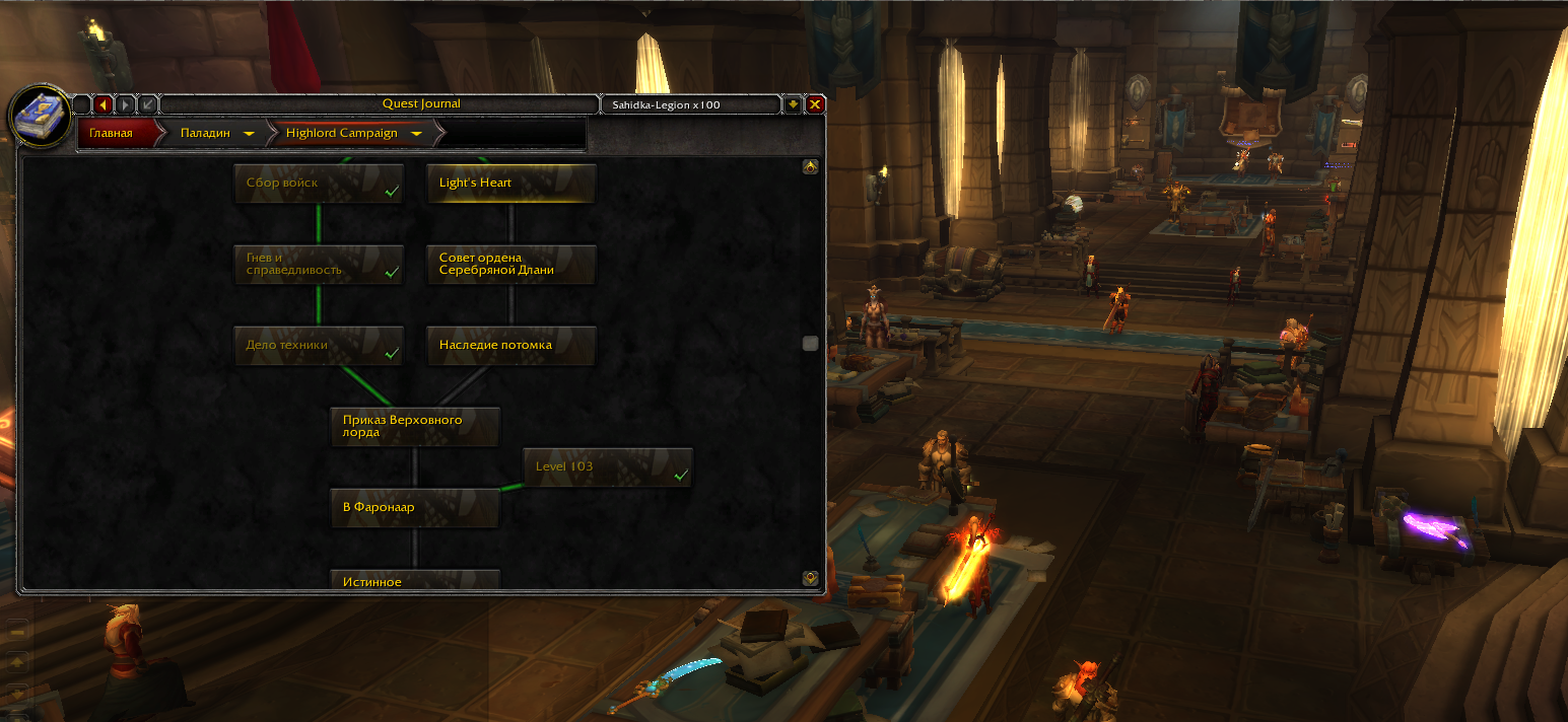Здравствуйте. Могу конечно ошибаться, но на скриншоте видно, что одна из веток квестов у Вас не сделана. А начинается она , насколько я помню не в оплоте паладина, а в Даларане, цитадели у Кадгара. Тиросс должен был отправить в Даларан с квестом https://ru.wowhead.com/quest=42866 но сам нужный квест можно подхватить непосредственно у Кадгара https://ru.wowhead.com/quest=44257 , обратите внимание что у паладинов и у всех осталных этот квест выдается с одинаковым названием, но для паладинов этот квест с другим ИД - то есть специальный. Сделаете цепочку квестов по светоносному объекту, принесете в оплот Сердце света и продолжите уже в оплоте выполнять квесты. Смысл рекомендации - посмотреть в Даларане у Кадгара квест Падающая звезда и выполнить всю цепочку начиная с этого квеста. |
