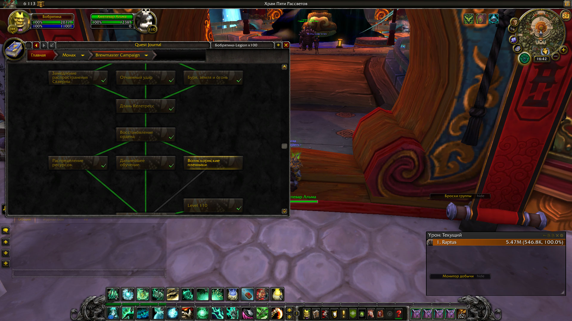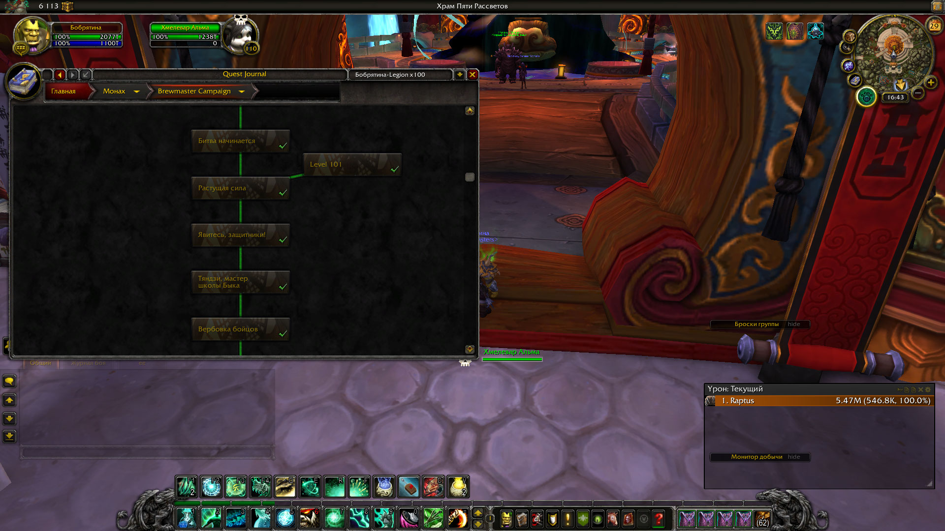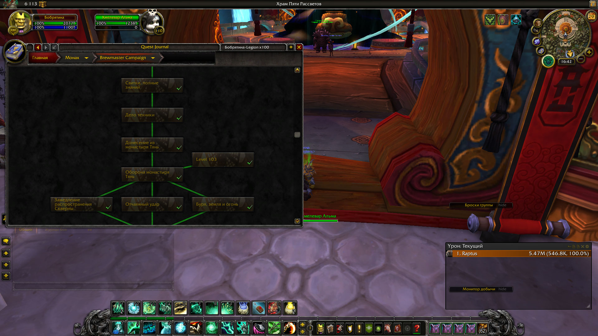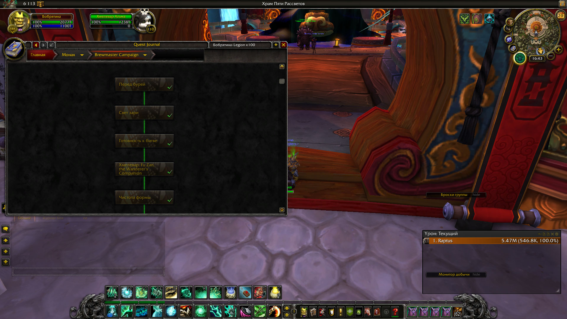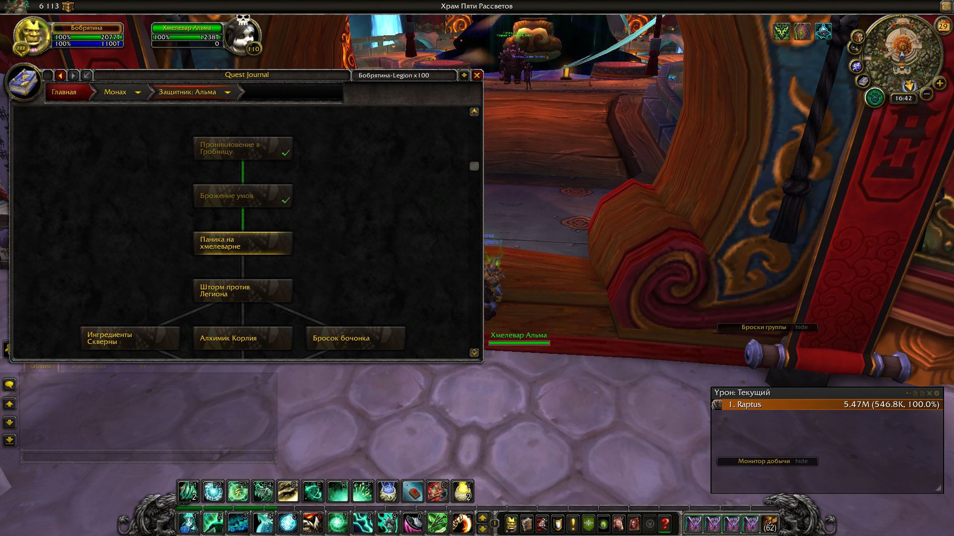 Дело в том, что я не являюсь тестером и значит легко и просто не могу создать себе персонажа-монаха для проверки описанных Вами багов. Но даже если бы и мог - сначала следует разобраться, что по факту происходит. Когда я делаю квесты оплота на любом персонаже, то в аддоне BtwQuests я наблюдаю, как последовательно, от самого первого и вплоть до последнего квеста кампании оплота на прямоугольниках с квестами появляются зеленые птички, указывающие на то, что квесты выполнены. А линии от одного квеста к следующему показывают взаимосвязи и возможно условия получения следующего квеста. То есть в процессе выполнения квестов вообще не должна возникать ситуация, когда выполнен какой то квест, а предваряющий его не выполнен. Исключение - некоторые квесты в кампании оплота некоторых классов, выполняемые в подземельях - несмотря на указанную зависимость, некоторые квесты могут быть пропущены или отложены на потом. например у приста хвост цепочки на получение защитника можно оставить на после всего. Какой информацией поделились Вы? Один артефакт есть, еще двух пока нет. Сначала Вы связали получение второго артефакта и квест https://ru.wowhead.com/quest=42186/%D1%80%D0%B0%D1%81%D1%82%D1%83%D1%89%D0%B0%D1%8F-%D1%81%D0%B8%D0%BB%D0%B0 . Затем Вы сообщили что у Вас как бы доступны квесты https://ru.wowhead.com/quest=41909/%D0%B2%D0%BE%D0%BB%D0%BD%D1%81%D0%BA%D0%BE%D1%80%D0%BD%D1%81%D0%BA%D0%B8%D0%B5-%D0%BF%D0%BB%D0%B5%D0%BD%D0%BD%D0%B8%D0%BA%D0%B8 и https://ru.wowhead.com/quest=45404/%D0%BF%D0%B0%D0%BD%D0%B8%D0%BA%D0%B0-%D0%BD%D0%B0-%D1%85%D0%BC%D0%B5%D0%BB%D0%B5%D0%B2%D0%B0%D1%80%D0%BD%D0%B5 , которые по сюжету кампании оплота разделены десятком других квестов. И опять таки непонятно, эти квесты Вы получили и выполняете, не можете получить , потому что их не выдают НПС или Вы их уже выполнили. если в цепочке квестов оплота присутствуют разрывы - напрашивается вопрос - а что за персонаж у Вас? Когда он был создан, на каком сервере, был ли перенесен с другого сервера? Сделайте скриншоты окна аддона на цепочках артефактов, всех трех. Сделайте скриншоты на цепочке квестов кампании оплота монаха, начиная с первого из квестов, который в аддоне помечен как невыполненный. Если ниже этого квеста обнаружены квесты, которые уже выполнены - сделайте скриншоты и этих участков кампании оплота. Не обращайте пока что внимания на остальные разделы аддона, только первый и второй разделы - оплот и артефакты (получение артефактов). |