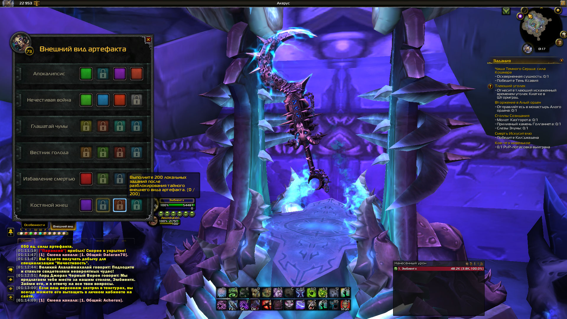 | Description | После открытия скрытого облика артефакта https://ru.wowhead.com/item=139548/%D0%BA%D1%80%D1%8E%D0%BA-%D0%B6%D0%BD%D0%B5%D1%86%D0%B0-%D0%BA%D0%BE%D1%81%D1%82%D0%B5%D0%B9 не засчитываются критерии для открытия других расцветок данного артефакта, а именно "Выполнить 200 локальных заданий" и "Пройти 30 подземелий Legion" Изначально счётчик работал, но после достижения 200 и 30 сбросился до 0 и больше не считает. Компания оплота рыцаря смерти пройдена полностью. Также на другом персонаже на этом же аккаунте (Охотник) расцветки для скрытого артефакта открыты, т.е счетчик работал корректно. | ||||