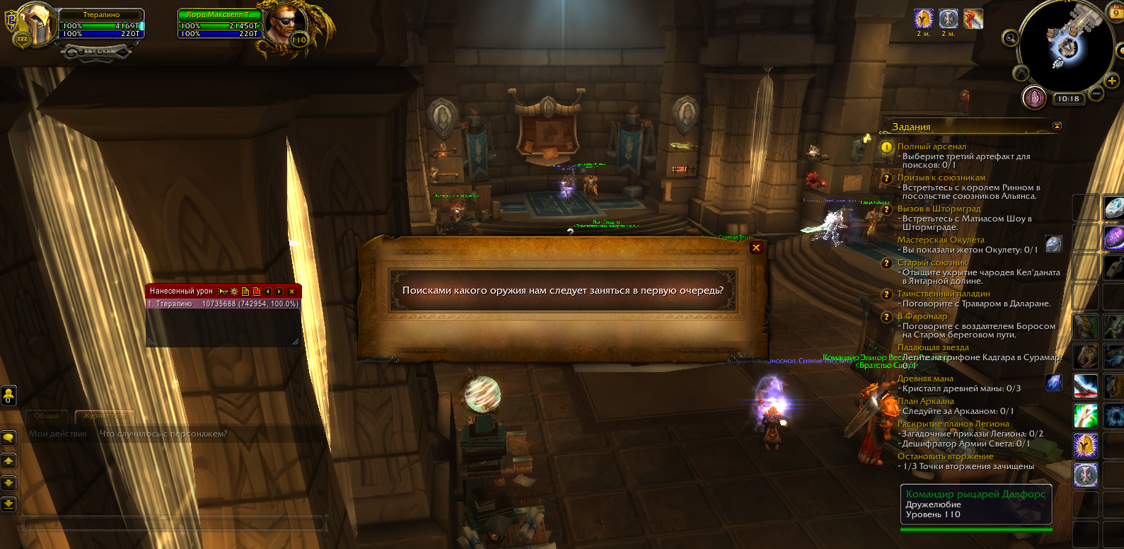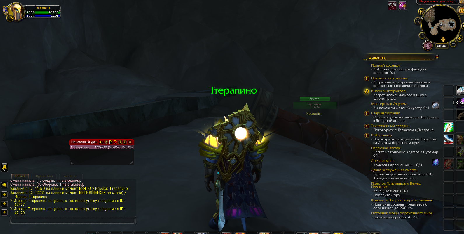 Проверил квест работает. http://egammi.net/image/SxNo Проверьте еще .q s 38710 .q s 40408 Персонажа переносили с другого сервера? На каком сервере играете uwow/epic/argus ? Когда персонаж был создан 7.0-7.2 ? |
