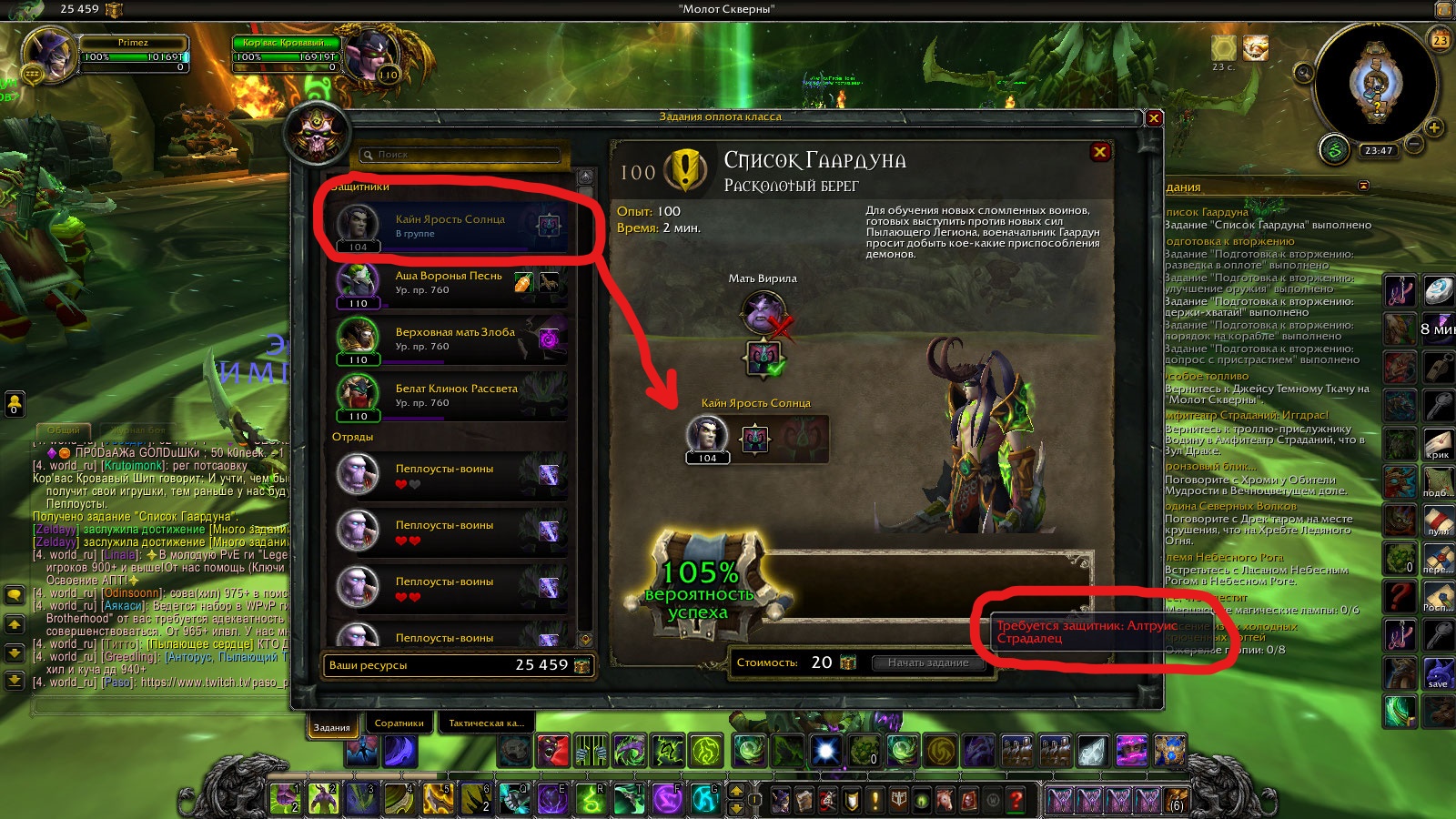 | Description | не могу выполнить задание оплота класса Список Гаардуна так как у меня защитник Кайн Ярость Солнца, а в задании требует защитника Алтруис Страдалец | ||||