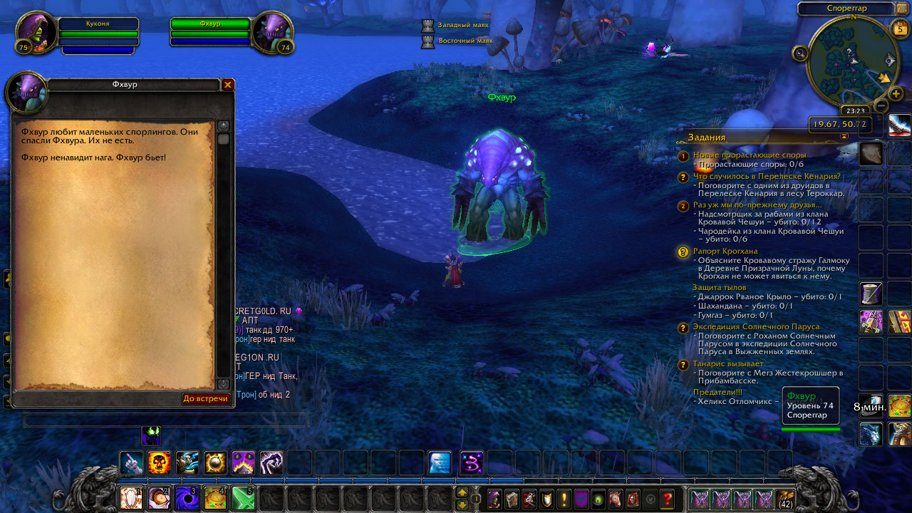 Аддон полезен уже тем, что позволяет быстро найти квесты и расположение квестодателей, которые еще не были выполнены в локации. В случае с Спореггаром аддон еще помогает (в некоторых случаях) начать рвать на голове волосы и говорить себе - "ну чем я думал раньше?" Потому что цепочка Спореггара содержит граничные квесты. Начало - ненависть со Спореггаром Улучшение репутации: убийство мобов и выполнение квестов https://ru.wowhead.com/quest=9739 (одноразовый) https://ru.wowhead.com/quest=9743 (одноразовый) после выполнения двух квестов выдается граничный квест https://ru.wowhead.com/quest=50131 - достигнуть нейтрала с спорлингами. Если нейтрала добить на мобах, не выполняя первые два квеста, то они исчезнут и сюжетка Сопреггара буедт сломана безвозвратно. Повторяющийся вариант двух первых квестов поволяет получить нейтрала, выполнить квест 3 и пойти дальше. https://ru.wowhead.com/quest=9919 после сдачи этого квеста Вы получаете второй граничный квест https://ru.wowhead.com/quest=50130 https://ru.wowhead.com/quest=9806 и повторяющийся квест https://ru.wowhead.com/quest=9807 Завершаете квест https://ru.wowhead.com/quest=50130 и должны получить квест https://ru.wowhead.com/quest=9726 , а после его сдачи повторяющийся https://ru.wowhead.com/quest=9727 Также доступны квест https://ru.wowhead.com/quest=29691 и затем https://ru.wowhead.com/quest=29692 На каком то уровне репутации (уважение или почтение) у https://ru.wowhead.com/npc=17877 появляется квест https://ru.wowhead.com/quest=9729 , сдав который мы получаем зачем критерия в ачивке. Мне все равно надо было добивать репутацию с Сопреггаром до превознесения, так что не составило проблемы насобирать гибискус, а потом сдавая повторяющийся квест, подхватить последний квест. Но если Вы думаете, что у меня с этой локацией все получилось быстро легко и ровно, Вы очень сильно ошибаетесь. Во первых, всех персонажей я в процессе прокачки гонял по Запределью, выполняя некоторые квесты. А после установки на сервера обновления 7.3.5 прогресс квестов и репутации был просто сброшен. И мои попытки быстро восстановить прогресс были безуспешны. Во вторых сюжетка была несколько раз запорота просто потому что : на мобах можно набить репутацию, но если вовремя не остановиться пропадают начальные квесты южнее Спореггара, а потом и в самом Спореггаре. В третьих -если максимально приближать репутацию к границе недоверие/нейтрал или нейтрал/дружелюбие и потом пытаться сдавать квесты - легко можно перескочить границу и снова потерять доступ к квестам. Такова стратегия прохождения цепочки квестов у спорлингов, это придумано Близзами. Информация разрозненна, но ее можно найти на вовхеде и других ресурсах в сети. Вам все еще требуются подсказки или Вы сможете выписать последовательность квестов цепочки Спореггара и проверить на пропуски? |