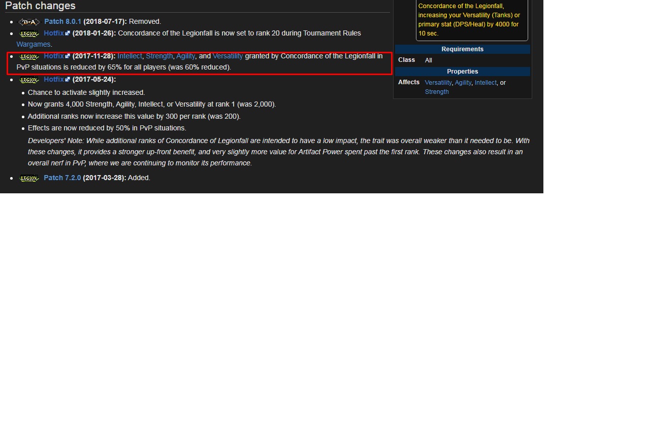 | Description | Не правильный прок способности артефакта "Согласованность армии погибели Легиона" Не правильно работает аура "Согласованность армии погибели Легиона" https://ru.wowhead.com/spell=242583/%D1%81%D0%BE%D0%B3%D0%BB%D0%B0%D1%81%D0%BE%D0%B2%D0%B0%D0%BD%D0%BD%D0%BE%D1%81%D1%82%D1%8C-%D0%B0%D1%80%D0%BC%D0%B8%D0%B8-%D0%BF%D0%BE%D0%B3%D0%B8%D0%B1%D0%B5%D0%BB%D0%B8-%D0%BB%D0%B5%D0%B3%D0%B8%D0%BE%D0%BD%D0%B0 На PvE Цели (NPC) при 101 уровне Артефакта дает 18700 ед. Силы На PvP цели (Игрок) при 101 уровне Артефакта дает всего 6545 ед. Силы Должно давать 18700 ед. Силы и на npc и на игроках Получается игрок платит 100% стоимости за повышение артефакта до 101 уровня, а получает при применении на PvP-целях лишь 35% от эффективности ауры. Доказательство: https://www.youtube.com/watch?v=fkoRJusaxoI | ||||