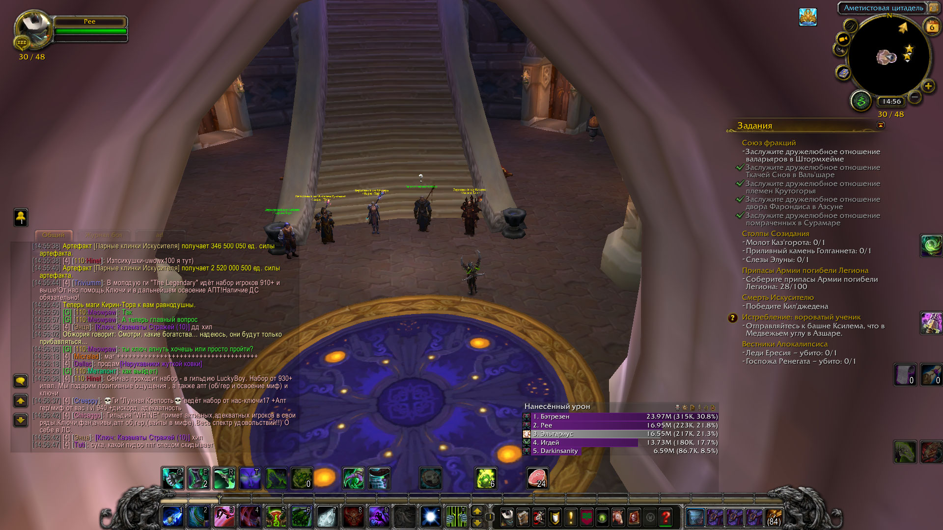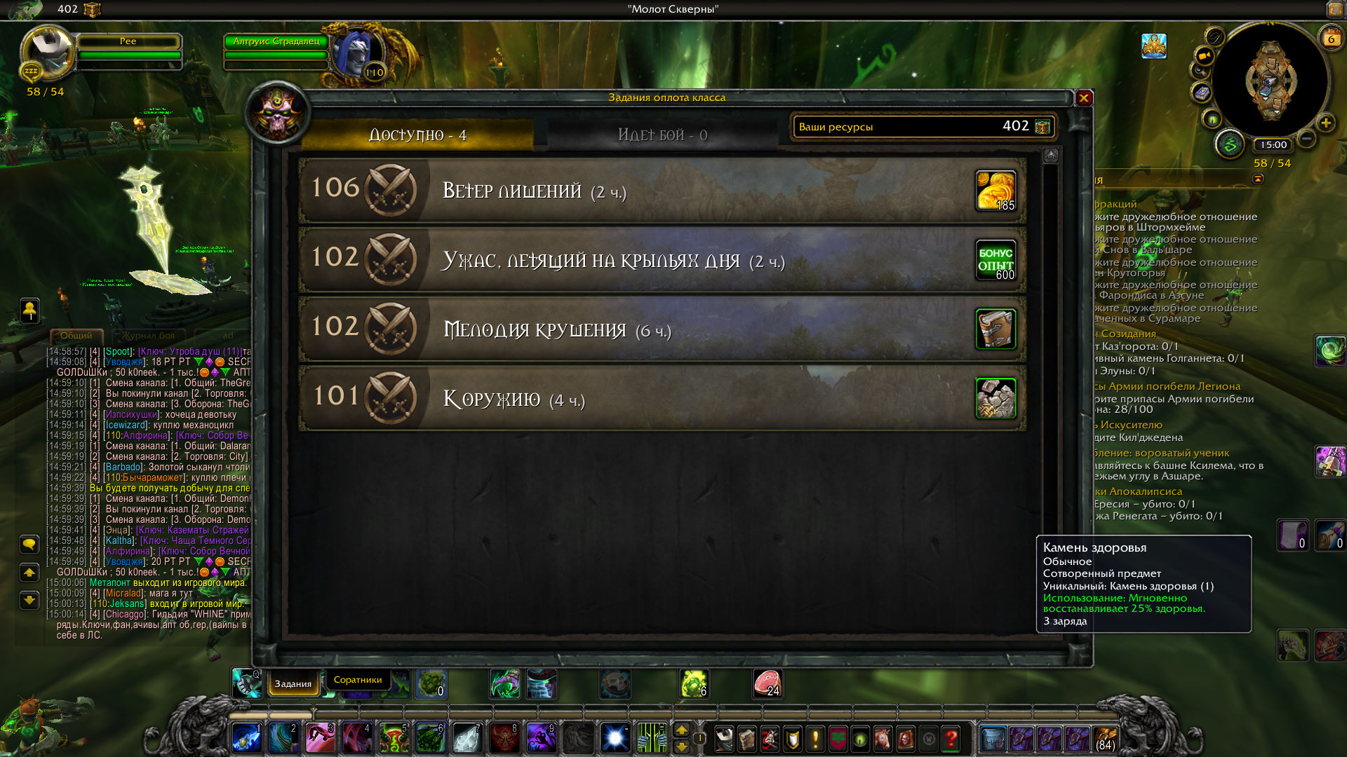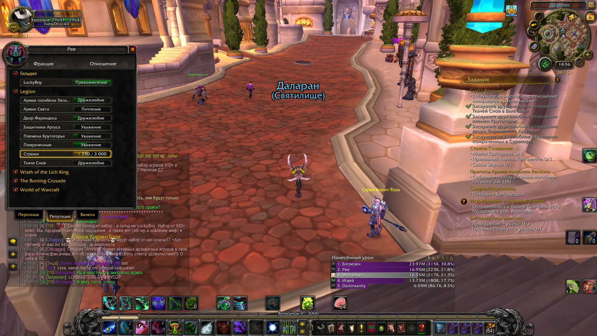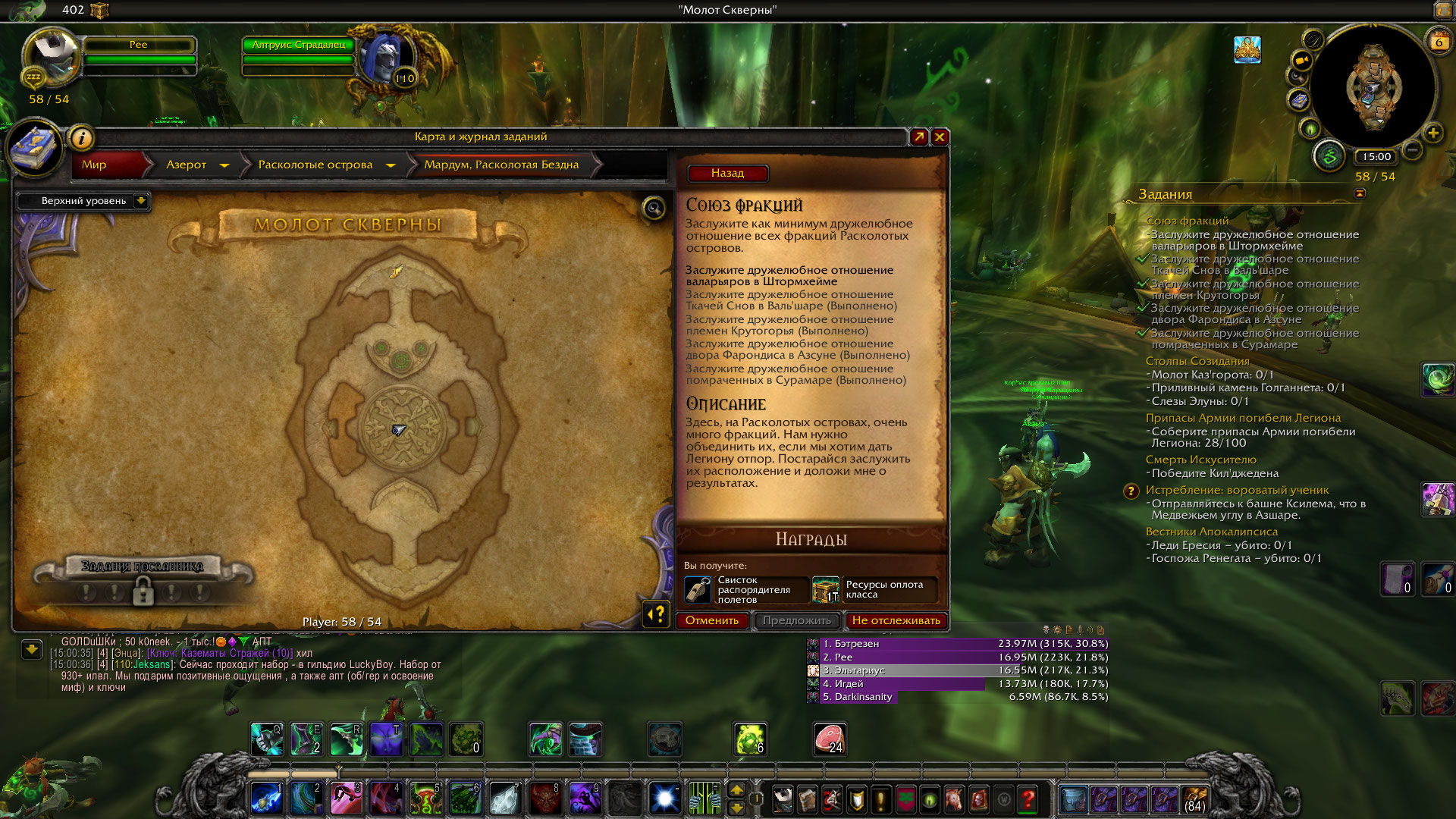Персонаж - размеренное существование на сервере с момента создания, или всякие издевательства типа переноса с другого сервера, смена фракции, расы, пола или класса? То есть чем усугубили ситуацию? Проверочная проверка. Таргет на себя, в белом чате вводить команды, делать скриншоты. скриншоты сюда. Для Орды: .q s 39864 .q s 44701 .q s 38307 .q s 39698 .q s 39801 Для Альянса .q s 39735 .q s 44700 .q s 38035 .q s 38206 .q s 39800 Можете поискать если интересно описания квестов, особенно, если часть из них выполнены. И как костыль, чтобы сначала добиться успеха, а потом искать крайнего. В Валдисдале потыкать в диалоги НПС с названием фракции Валарьяров в тултипе. В Интенданта например. Для того чтобы появилось сообщение в чате "Теперь Валарьяры к Вам равнодушны". После этого можно будет искать мобов и нарабатывать репутацию. На Вовхеде пишут, что к этим мобам можно добраться от полетки Дозор Куллен/Дозор Лорны с помощью дракона Ветир (диалог "Пик Торима, что у границ приюта Торигниров" (2 строчка диалога)), но неизвестно можно ли его использовать до прохождения сюжетки. А так - такси, гарпун и крюки на скалах в помощь. Ниже Пика Торима площадка с мобами, в том числе мелкие бесы https://ru.wowhead.com/npc=92128/%D1%81%D0%BA%D0%B2%D0%B5%D1%80%D0%BD%D1%81%D0%BA%D0%BE%D1%80%D0%BD%D1%81%D0%BA%D0%B8%D0%B9-%D1%80%D0%B0%D1%81%D1%85%D0%B8%D1%82%D0%B8%D1%82%D0%B5%D0%BB%D1%8C#comments убивая которых Вы будете получать репутацию с Валарьярами. |