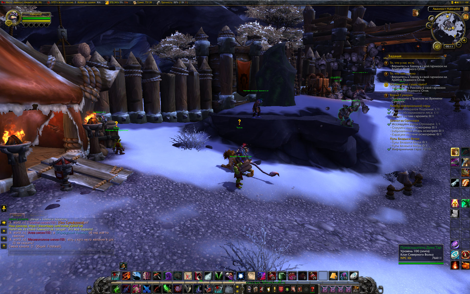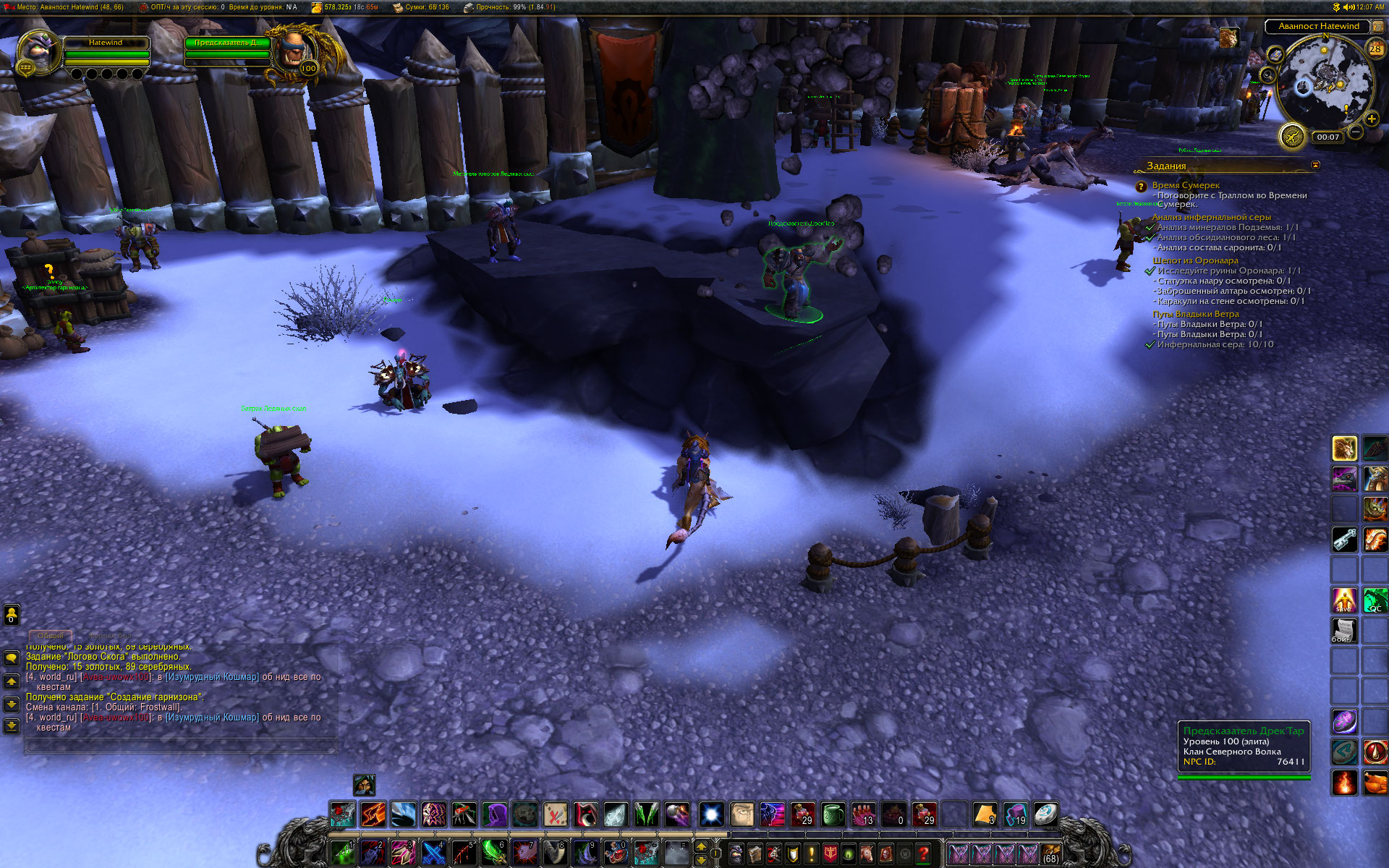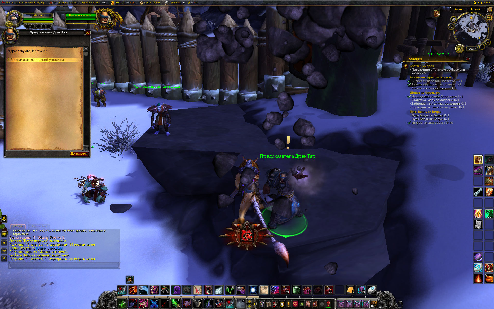 независимая экспертиза на сервере EpicWOW x1 (Орда) показала следующее: Если в столице фракции у дебагера сбросить гарнизон, то переход через Темный портал возвращает персонажа на цепочку квестов доступа к Дренору. Все как и задумывалось. По выполнении всех квестов цепочки персонаж попадает на Дренор, где начинается цепочка квестов по созданию гарнизона. Предсказатель Дректар встречает персонажа на берегу, провожает его к Дуротану, присутствует при планировании строительства. После создания гарнизона Предсказатель Дректар перемещается на камушек, где и стоит все то время, пока персонаж бегает по заданиям сюжетки первого критерия. С завершением квеста Миссия мыслима, засчитывается первый критерий достижения и у Предсказателя Дректара становится доступен квест Волчье логово. (Удивительно, правда?) О том, что Предсказатель исчезает после смены фазы в гарнизоне ( при повышении уровня гарнизона) уже было написано. Скриншоты прилагаются. |