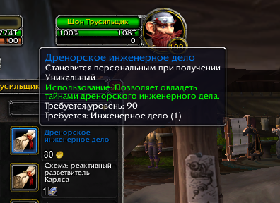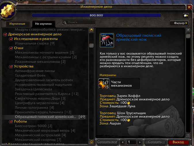 | Description | Отсутствует схема крафта ножа у торговцев. Инженерное дело Дренора покупал, использовал. Инженерное дело на 800 | ||||