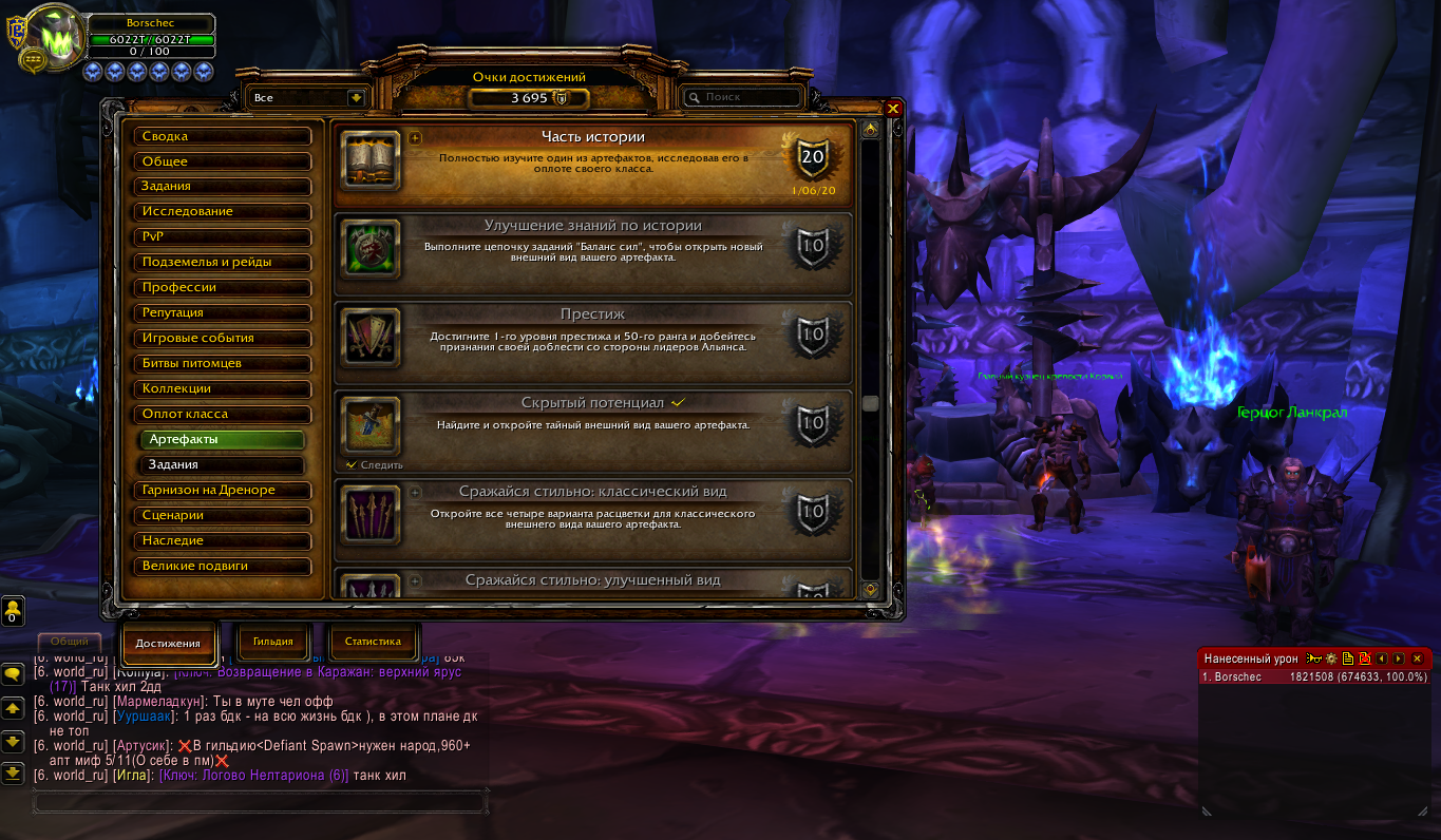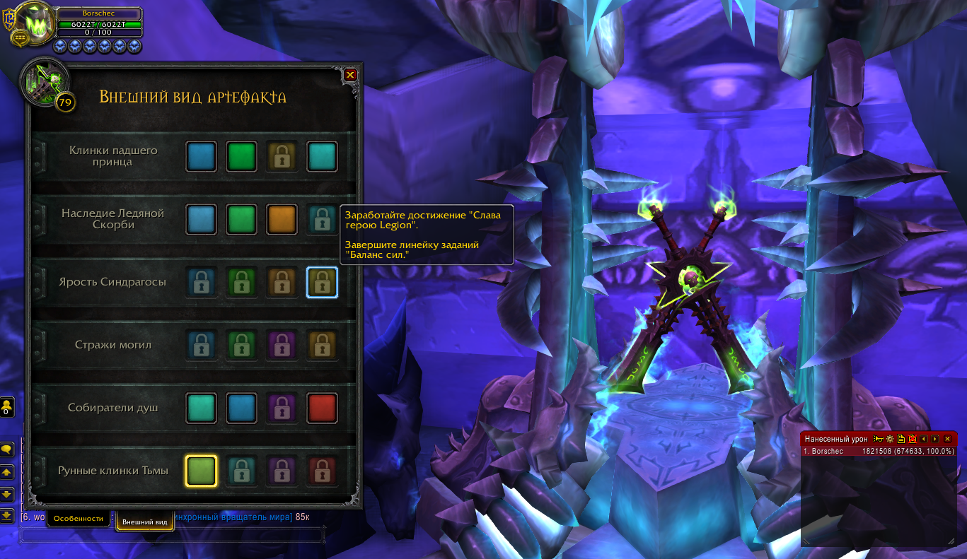 Здравствуйте. Скрытый облик у вас открылся после Башни магов или после того как выбили и изучили https://ru.wowhead.com/item=139547 ? Есть такая фигня, что скрытый облик становится доступен после прохождения Башни магов, кв "Дар Шестерых" вроде. И прогресс в этом случае не идёт. Чтобы работал прогресс для разблокировки новых расцветок нужно выбить итем. Здесь https://ru.wowhead.com/artifact-weapons-hidden-appearances-guide расписано получение скрытых обликов для всех артов. Если верить этой инфе, https://ru.wowhead.com/item=139547 падают с ворлд боса https://ru.wowhead.com/npc=106984 . Хотя недавно 1 игрок написал что выбил облик на фдк в цлк... Сам я его ещё не выбил, так что тут не уверен чему верить. Разработчик придёт и мб подскажет где точно он падает... |
