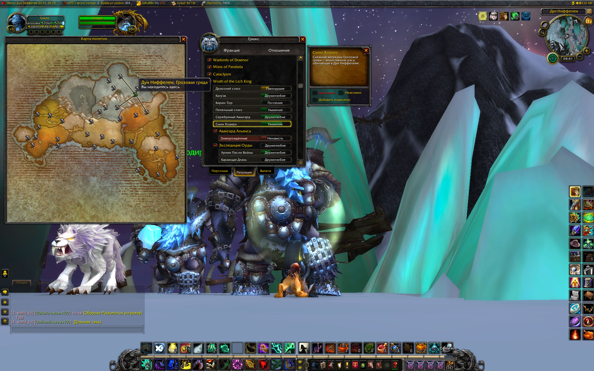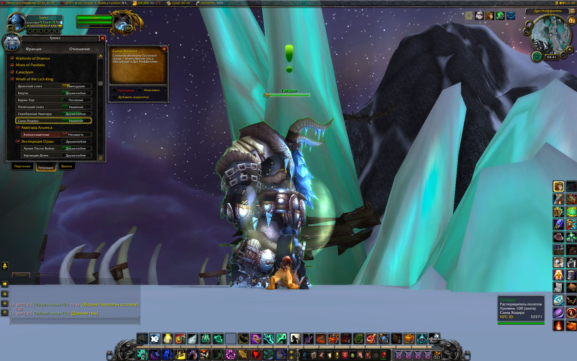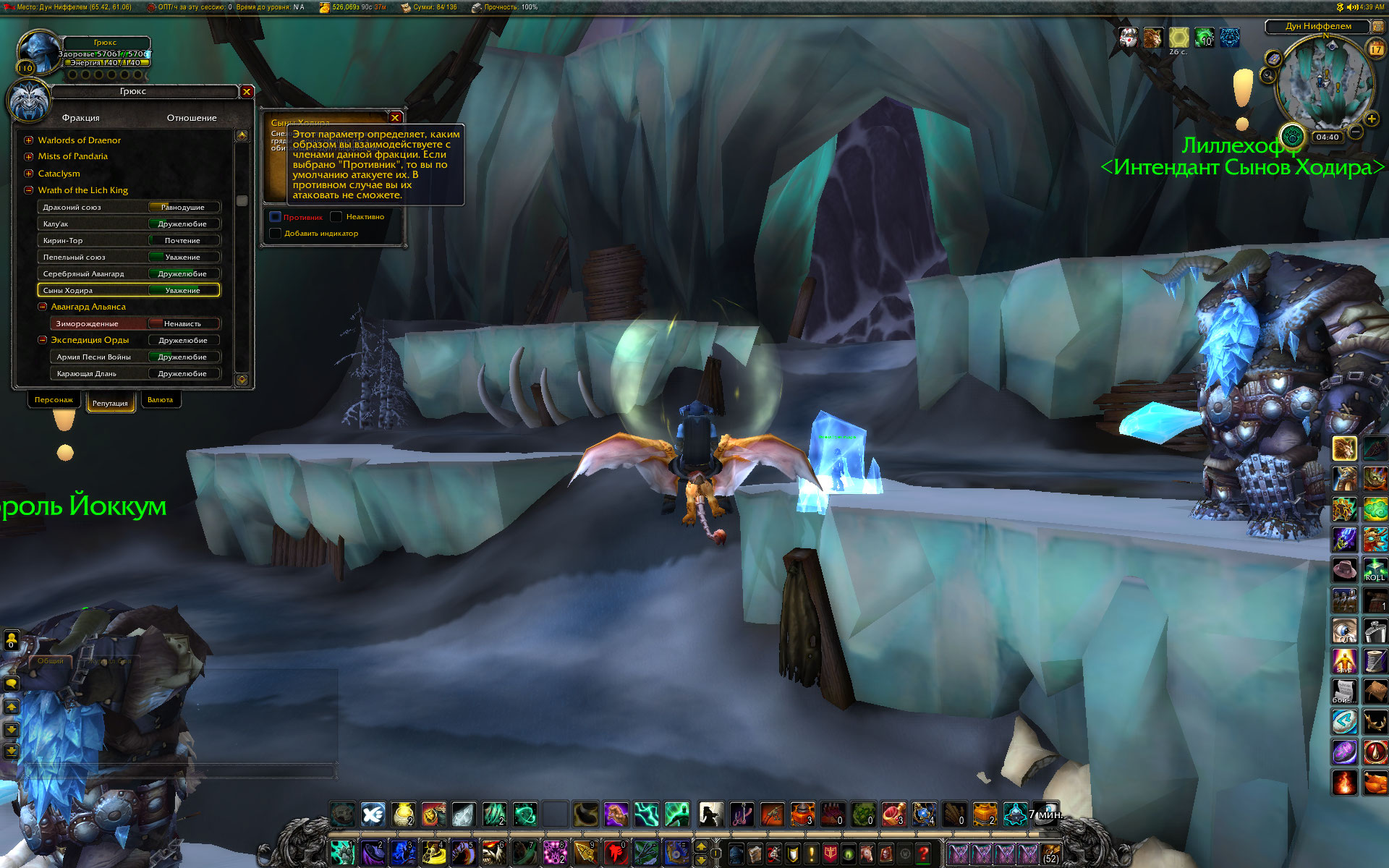 Привет. Фракция изначально враждебная, для взаимодействия нужно снять птицу "Противник". При желании потом птицу можно будет поставить обратно и снова снять . Полетчика исправили, работает нормально. Рекомендация - фармить или вечный лед (если исправили) или реликвии Ульдуара (работало и раньше). |