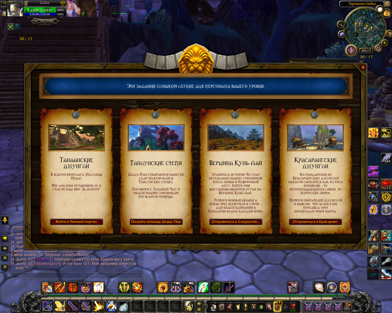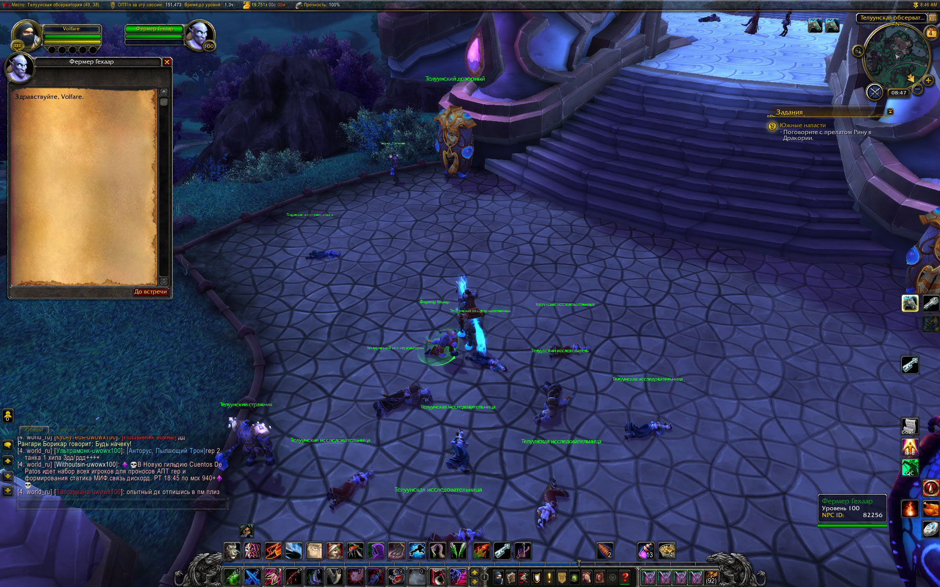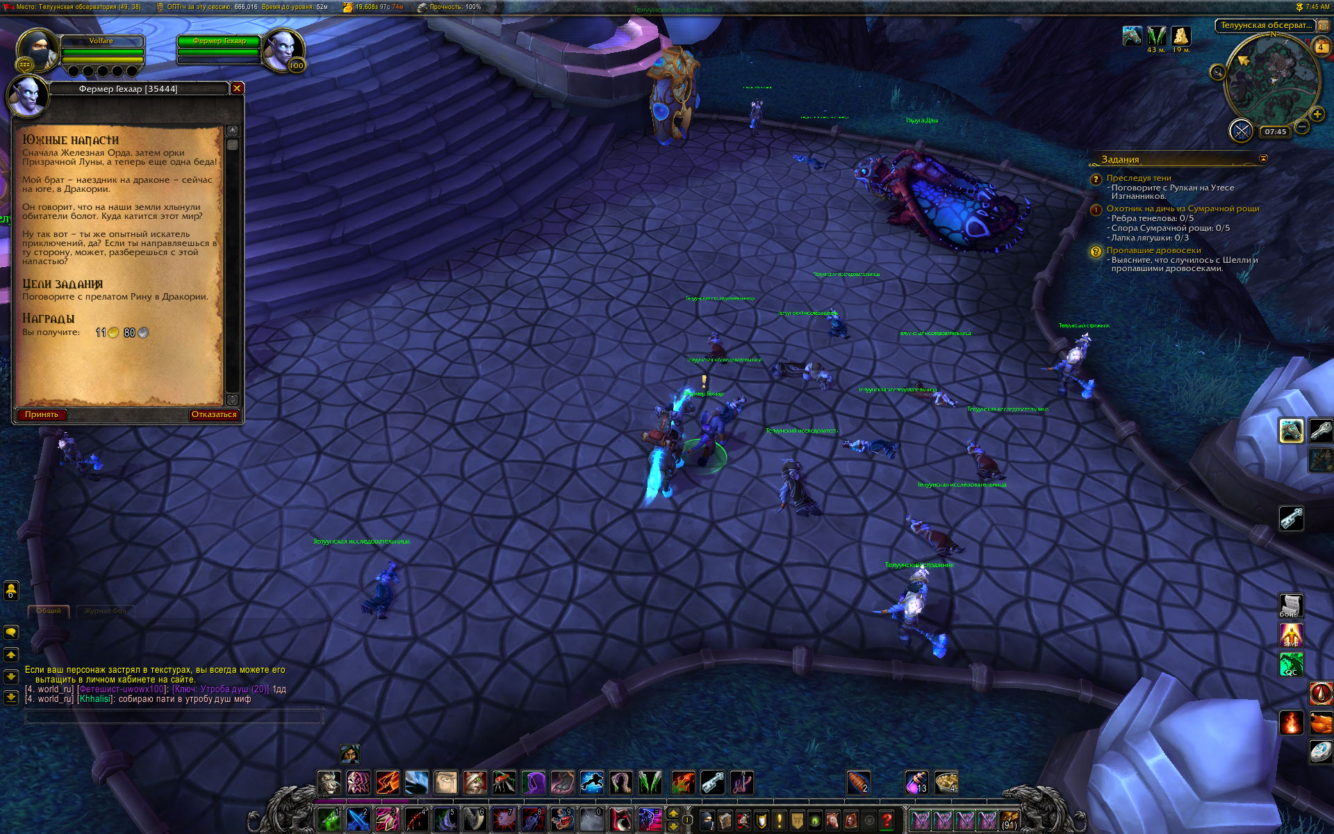 На вовхеде пишут, что если случайно выполнить более поздний квест, то этот будет недоступен. Проверка, таргет на себя, в белом чате ввести команды .q s 35450 .q s 33786 .q s 33787 .q s 33808 .q s 33836 .q s 34996 .q s 33788 .q s 35014 .q s 35006 .q s 34995 .q s 34994 .q s 34997 .q s 35015 .q s 35617 какие то из этих квестов обозначены как опциональные, неважно, проверка на то , что какие то квесты уже выполнены раньше. |