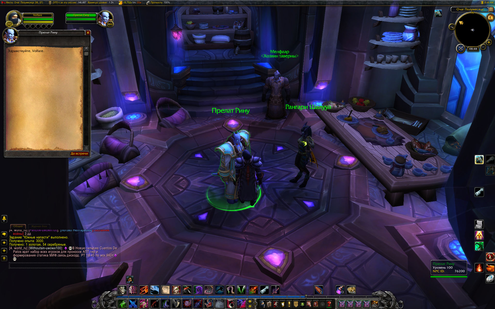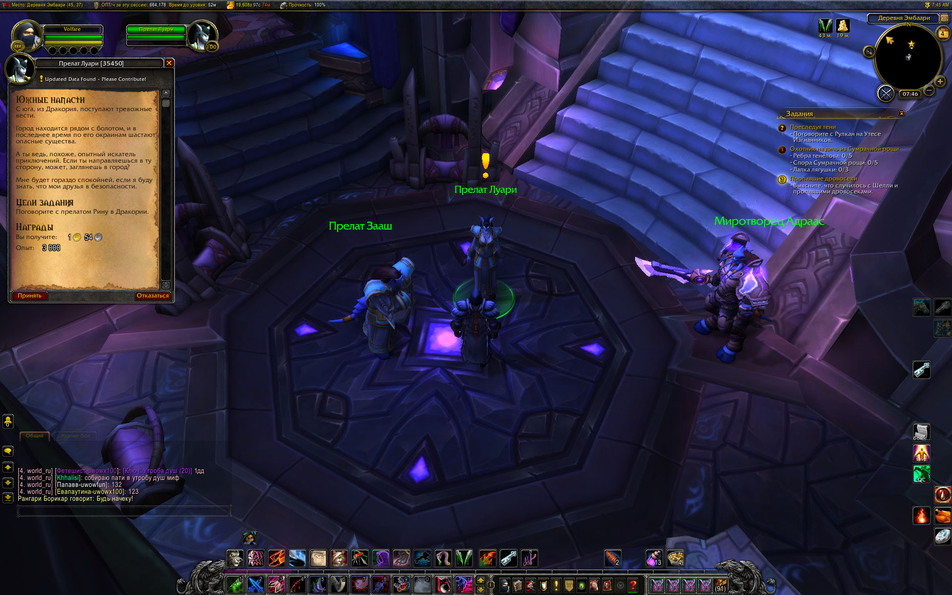 проверено. после взятия квеста из одного источника у другого квест пропадает. Кстати, на доске этого квеста нет. Доска просто дублирует доски из столицы, тогда как по вовхеду на ней должны присутствовать четыре вполне конкретных квеста и ничего больше. У прелата после сдачи квеста 35450 пустой диалог, то есть можно считать доказанным баг с невозможностью получить квест 33786, если преквестом является 35450. |