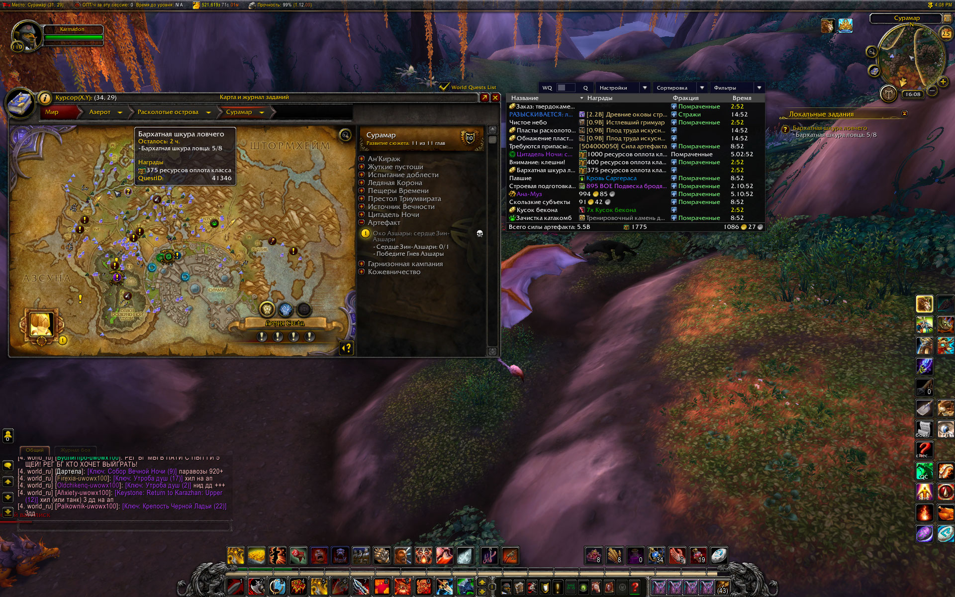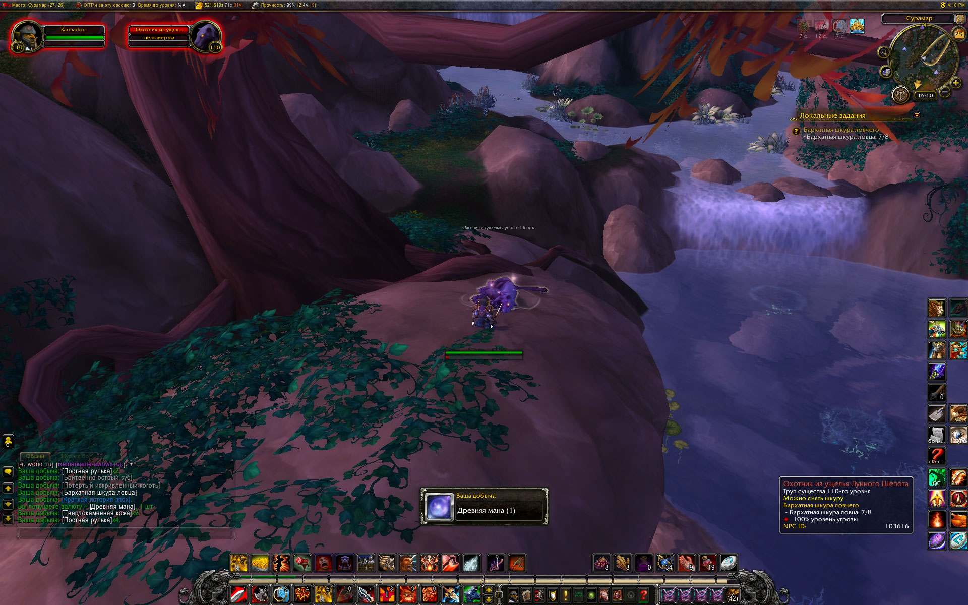 | Description | локальное задание https://ru.wowhead.com/quest=41346/%D0%B1%D0%B0%D1%80%D1%85%D0%B0%D1%82%D0%BD%D0%B0%D1%8F-%D1%88%D0%BA%D1%83%D1%80%D0%B0-%D0%BB%D0%BE%D0%B2%D1%87%D0%B5%D0%B3%D0%BE подразумевает использование навыка снятия шкур для получения квестовых итемов с мобов. Мобы https://ru.wowhead.com/npc=103616/%D0%BE%D1%85%D0%BE%D1%82%D0%BD%D0%B8%D0%BA-%D0%B8%D0%B7-%D1%83%D1%89%D0%B5%D0%BB%D1%8C%D1%8F-%D0%BB%D1%83%D0%BD%D0%BD%D0%BE%D0%B3%D0%BE-%D1%88%D0%B5%D0%BF%D0%BE%D1%82%D0%B0 живут только в Сурамаре , в и вокруг локации Ущелье Лунного шепота. проблема в том, что сама локалка выдается только , если игрок находится в зоне Сурамар. Как только игрок смещается в любую другую зону в границах действия локалки (Ущелье Лунного шепота, цитадель Лунных стражей) локалка деактивируется. Буквально: есть мобы но нет локалки или есть локалка но нет поблизости мобов. | ||||