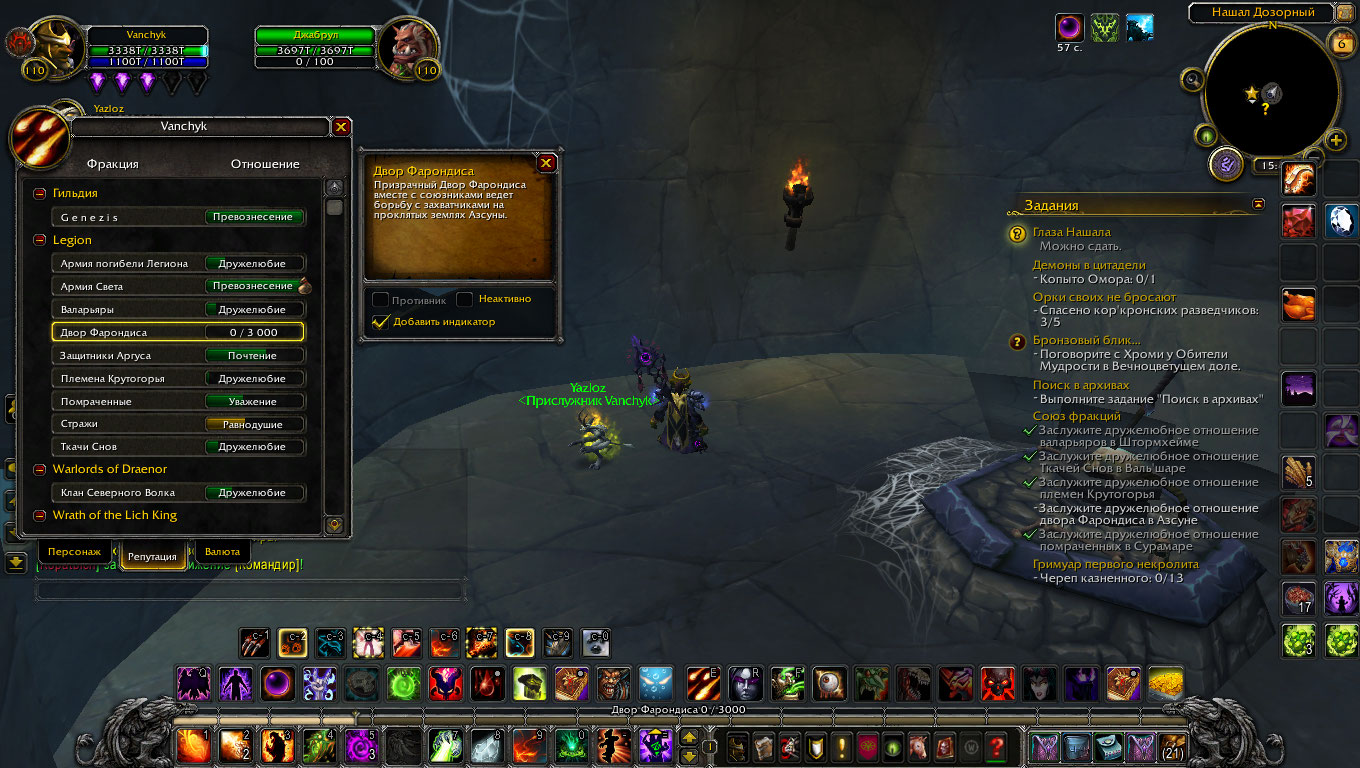 Привет. Когда завершается сюжетка и получается достижение (для Азсуны - Азсуна матата) то репутация оказывается между уважением и половиной примерно почтения у любой из фракций. Дальше репутация у всех качается выполнением локальных заданий и заданий посланника. Вы брали с тактической карты стартовый квест сюжетки на Азсуну? Хинт!!! полетка Логово Шекла (она видна на карте - птичка такая) , правее ее по карте отмель и крабы с гоблинами. Мобы с названием "...солемаг" дают репутацию с Двором Фарондиса после убийства. Действует до почтения (вроде, может до уважения) до дружелюбия пол часа фарма. |