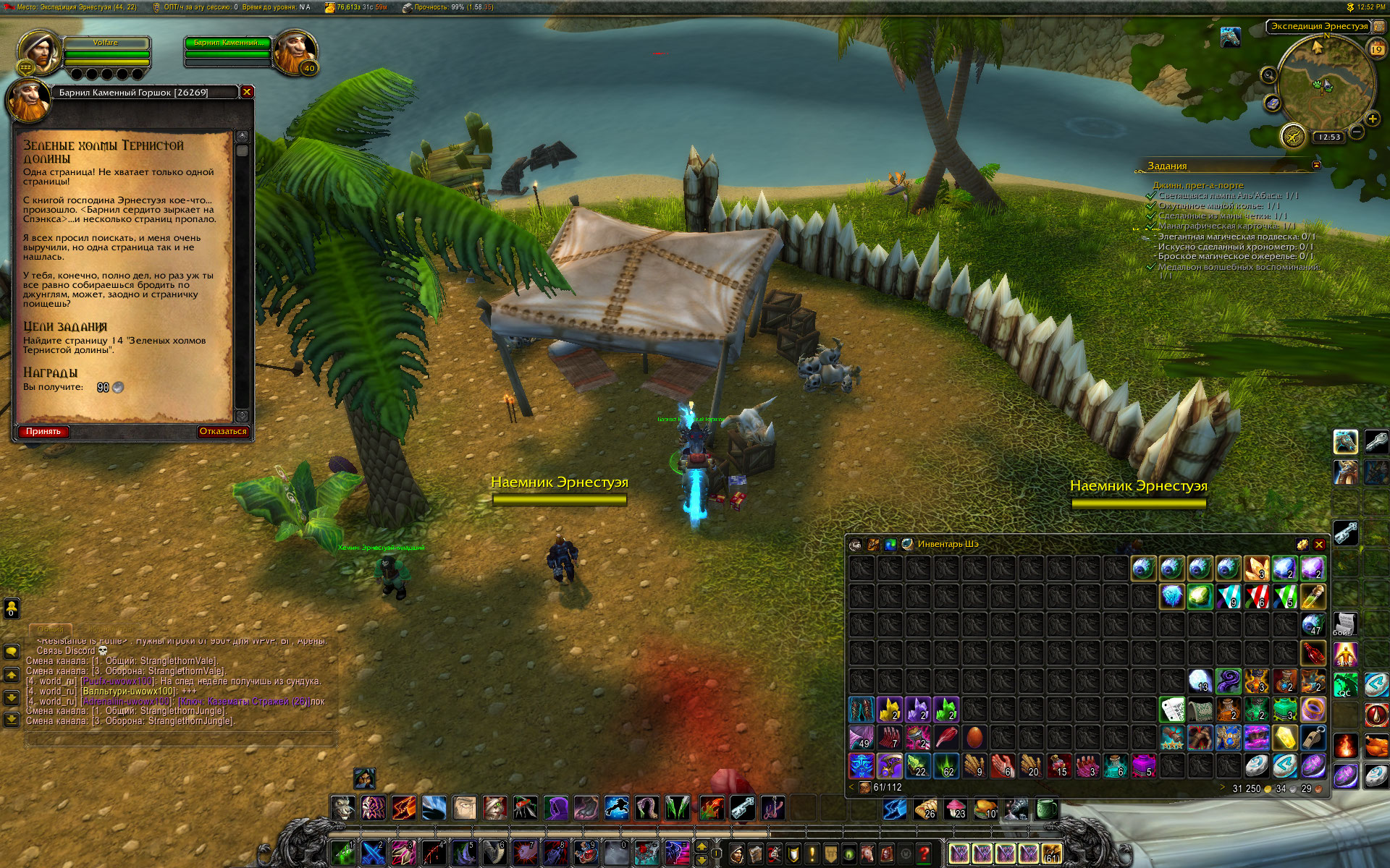 Квест упростили до безобразия, теперь нужно выбить всего одну страницу. У меня это заняло около 10 минут, и только потому что параллельно делал другие квесты в той локации и сдавал когда выполнил критерии нескольких квестов. Тигры, пантеры, крокозябры левее лагеря. во т пробежался. два скриншота - время в названиях. первый - взял квест, второй - выбил страницу. |
