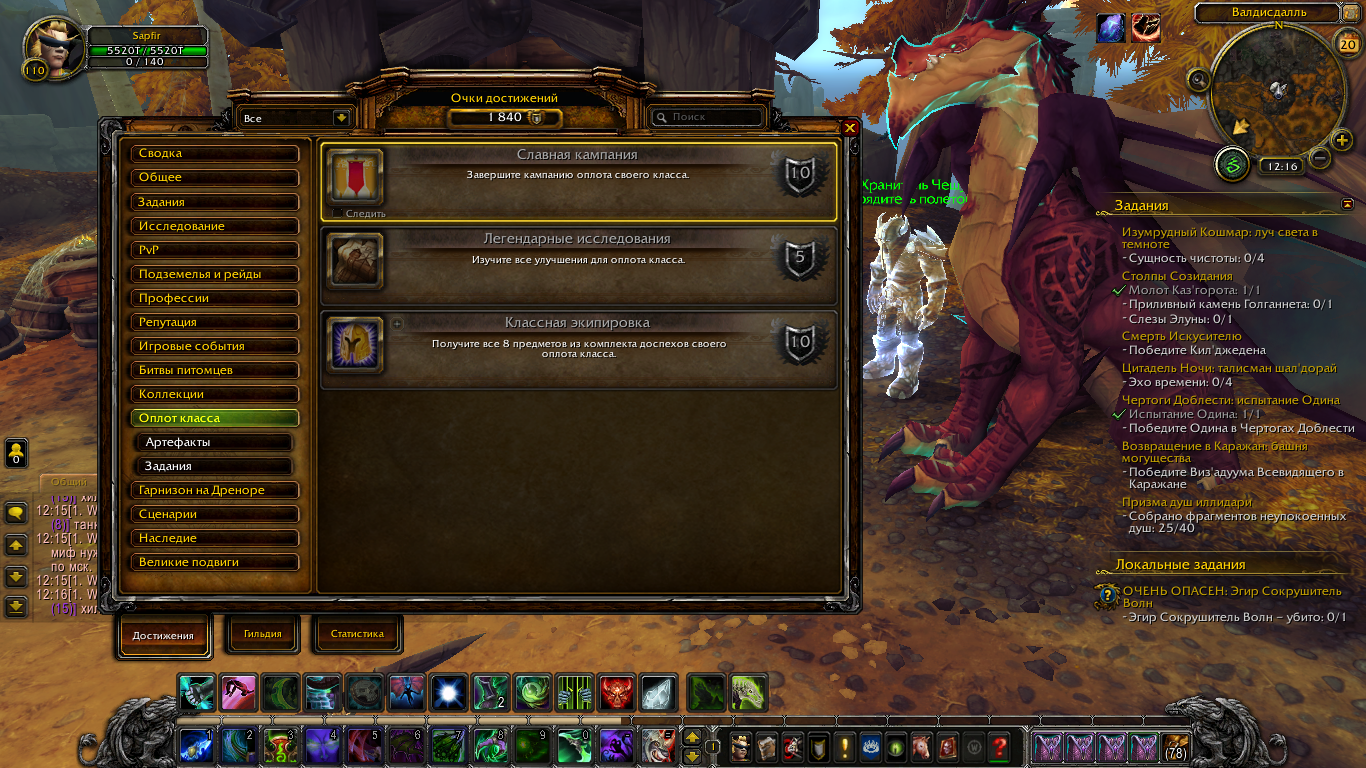 Нужно выполнить квесты в оплоте до квеста "Оружие героя" получить достижение https://ru.wowhead.com/achievement=10994 И сделать сюжет https://ru.wowhead.com/achievement=11546 минимум 4 этапа и после квеста 46247 появится нужный квест http://egammi.net/image/Sc3W http://egammi.net/image/Sc32 http://egammi.net/image/Sc3D Скиньте скриншот достижения и скрин с этой командой .q s 46247 Каким классом вы играете? Я дам вам нужный Id для проверки квеста "Оружие героя" P.s Скачайте этот аддон он поможет разобраться в цепочках если у вас что то не сделано. |