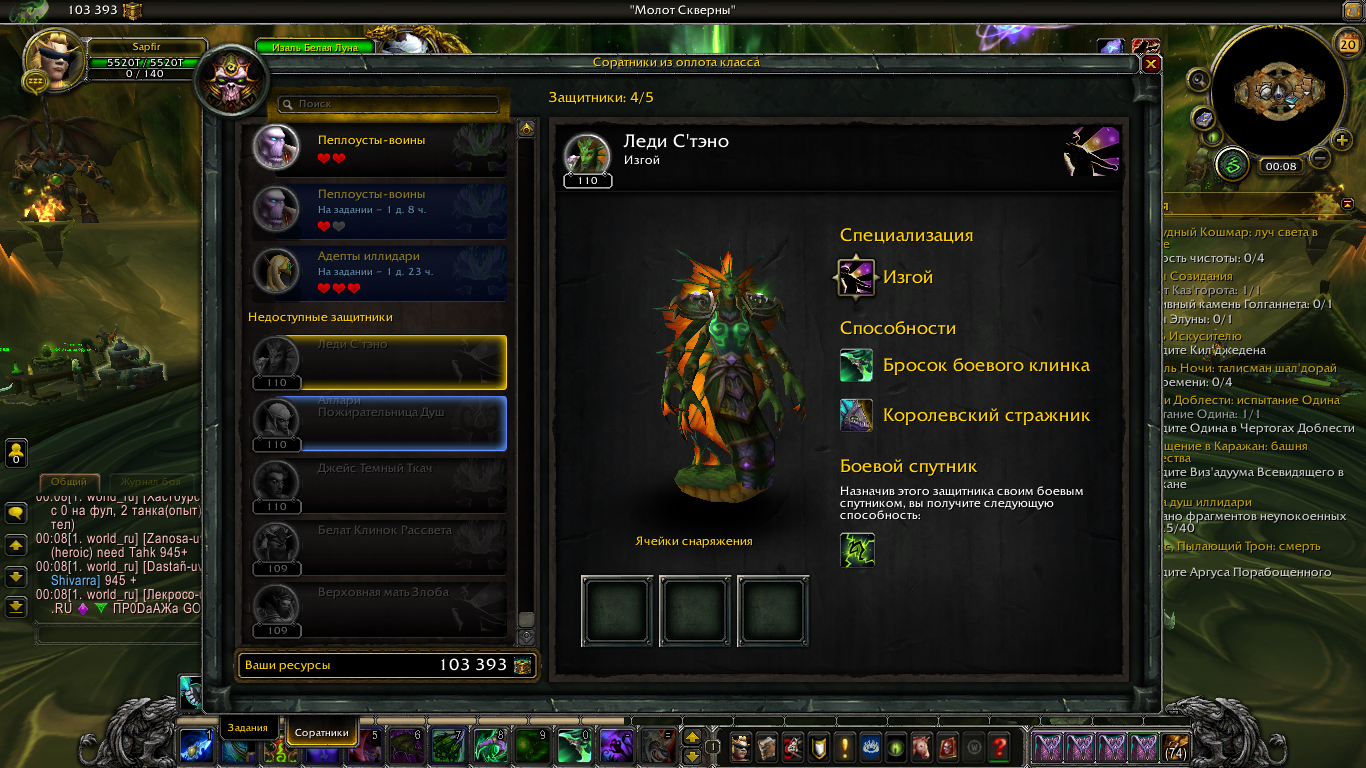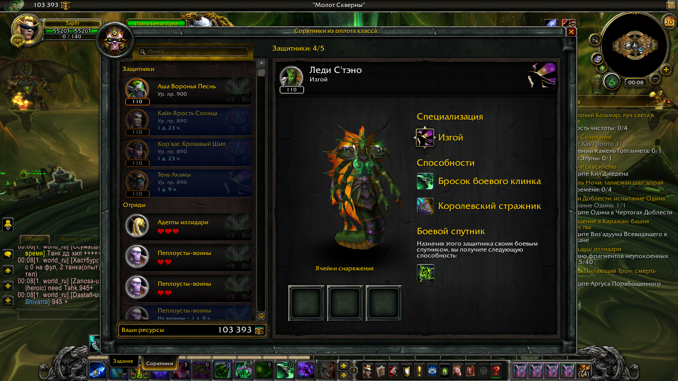 Вам нужно зайти в аддон в "Охотник на демонов" / "SLAYER CAMPAIGN" и скиньте скриншот на каком квесте у вас завершена цепочка Пример http://egammi.net/image/ScUL И Скиньте скриншот с командой .q s 47137 .q s 43412 У вас есть дискорд? Можете его сюда скинуть? P.s Скорей всего вы не сделали оплот до конца. В оплоте дх 54 квеста. По вашему скриншоту я могу сделать вывод что вы сделали 26+ квестов. После 26 квеста вы получаете 4 соратника, после 42 еще +2. Квесты на соратников https://ru.wowhead.com/quest=42671 / https://ru.wowhead.com/quest=42670 + 2 cоратника https://ru.wowhead.com/quest=42673 + 1 https://ru.wowhead.com/quest=42664 + 1 https://ru.wowhead.com/quest=42701 + 1 https://ru.wowhead.com/quest=42777 + 1 https://ru.wowhead.com/quest=43184/ + 1 https://ru.wowhead.com/quest=43185 +1 И того получается 8. На вашем скрине вы получили всего 4. После того как вы проходите полностью оплот вам будет доступен квест https://ru.wowhead.com/quest=47137 после этого квеста открывается цепочка и в конце цепочки вы получаете https://ru.wowhead.com/quest=45391 У нпс в конце компании https://ru.wowhead.com/npc=108527/ вы можете изучить талант https://ru.wowhead.com/order-advancement=490/ и увеличите количество соратников на +1. Кап будет 6 соратников |