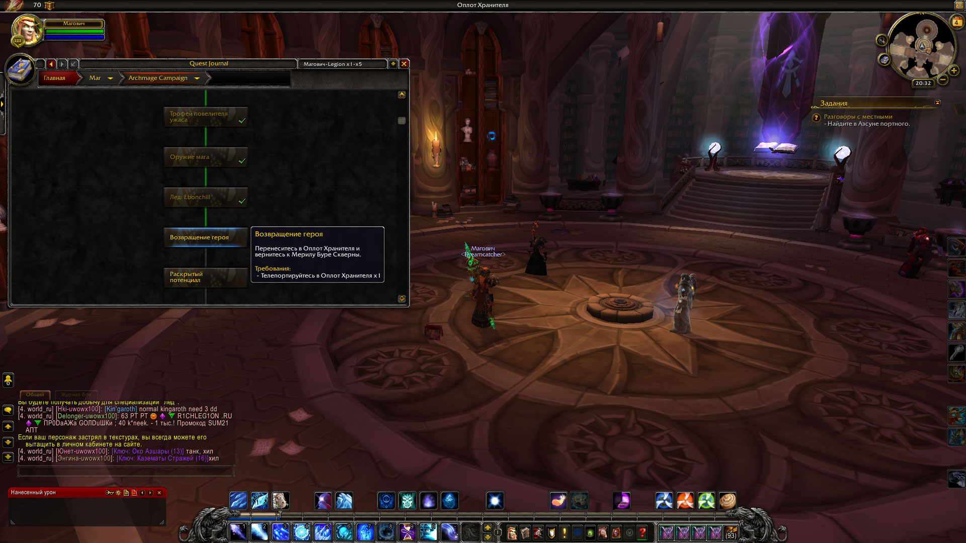 Здравствуйте. У вас просто не сделаны квесты оплота. Вам нужно сделать https://ru.wowhead.com/quest=41114/ https://ru.wowhead.com/quest=41114/ - автоматом берется после 1 артефакта в зоне или его можно взять у нпс https://ru.wowhead.com/npc=105081/ |