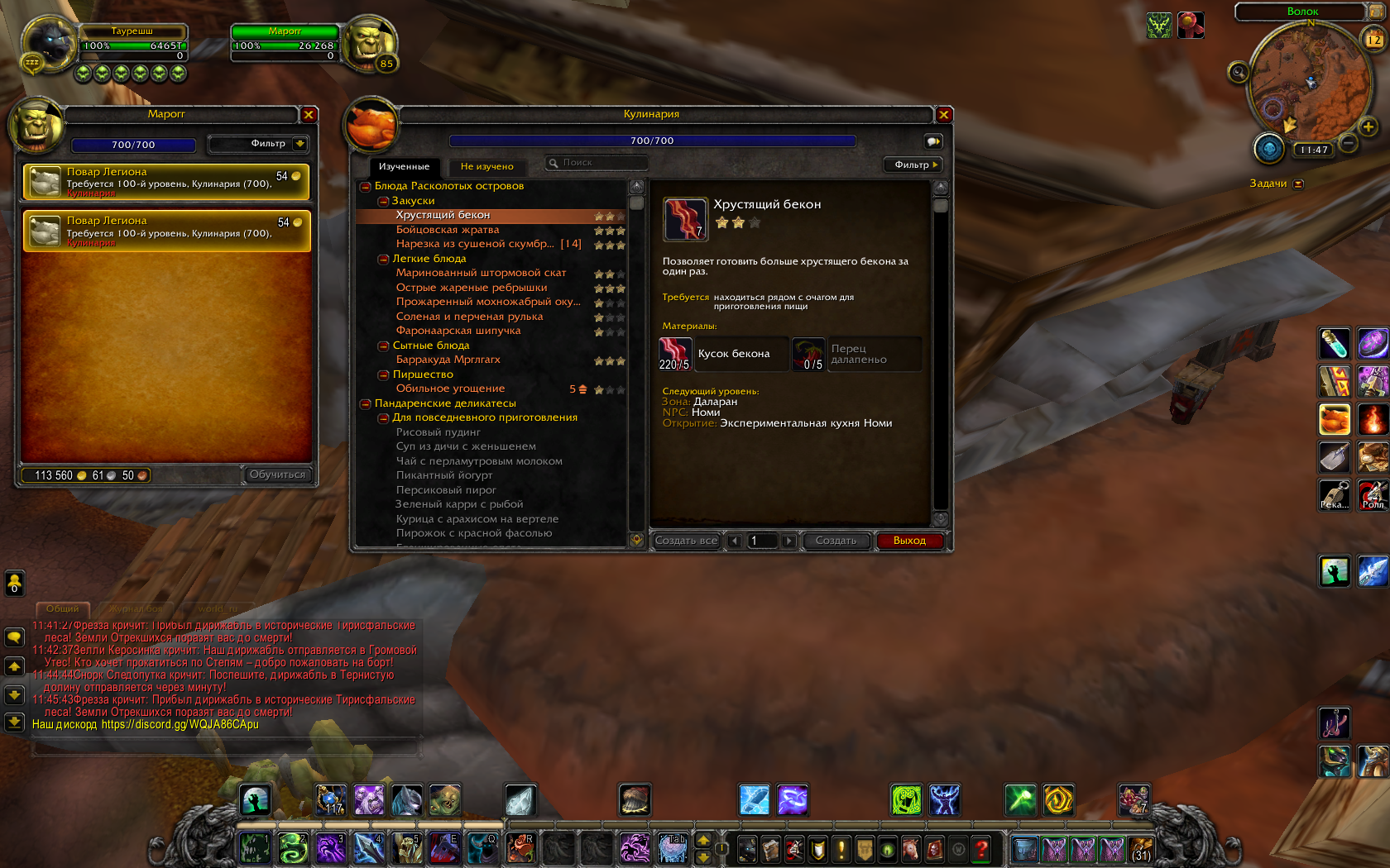 С некоторыми проблемами я все таки построил гарнизон в дреноре и выучил нужный рецепт - все заработало и кулинария на 800 обучилась. Благодарю за помощь и, думаю, до скорой встречи) Очень уж проблемный у меня персонаж после трансфера... |