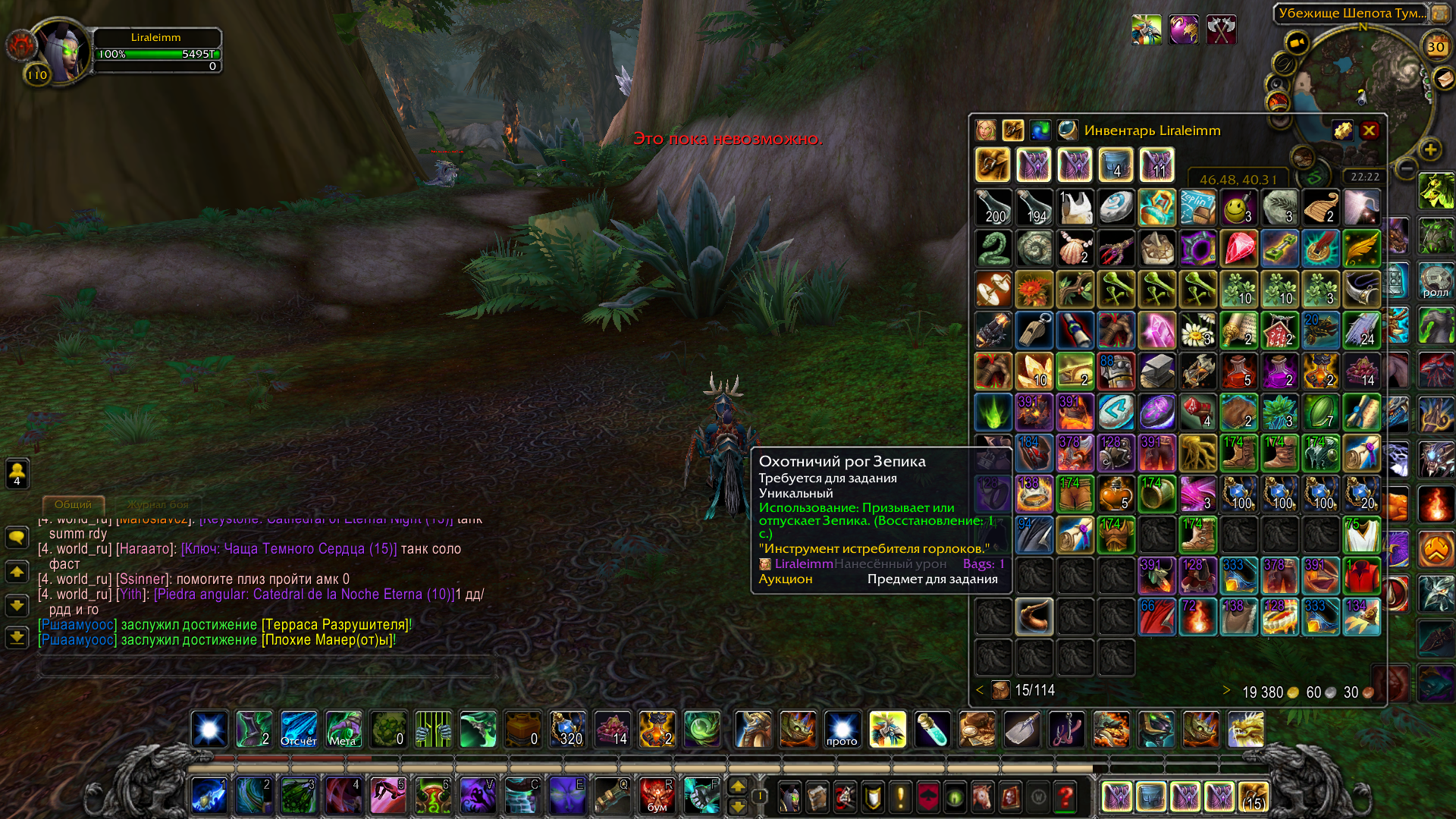 | Description | Этот квест невозможно выполнить, точнее сдать квест Зепику, который не вызывается через "Охотничий рог Зепика". Пишет, что "Это пока невозможно" (хоть на маунте, хоть просто, хотя квест уже считается выполненным) | ||||