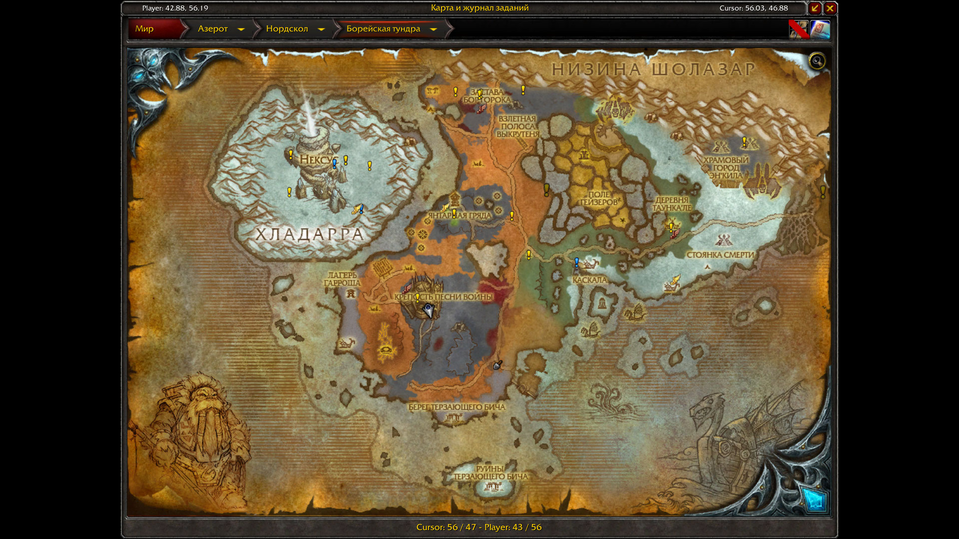 я полностью проверил всю карту по этому аддону и по вовхеду тоже - иногда не пропадают восклицательные знаки почему-то, но я и не выполнял "На заставу Боргрока" видимо это он и висит. Только вот никто там не предлагает квестов. Возможно дисконнект был при получении и пропал квест этот, т. к. буквально сегодня в Седых холмах взял https://ru.wowhead.com/quest=12137/%D0%BE%D1%81%D1%82%D1%8B%D0%BD%D1%8C-%D1%87%D1%83%D0%B4%D0%BE и после дисконнекта нет его, взять негде (автопринятия нет как написано на вовхеде), теперь жду рестатра сервера и может быть тогда автопринятие будет. Самый проблемный континент для получения Хранителя мудрости =( |